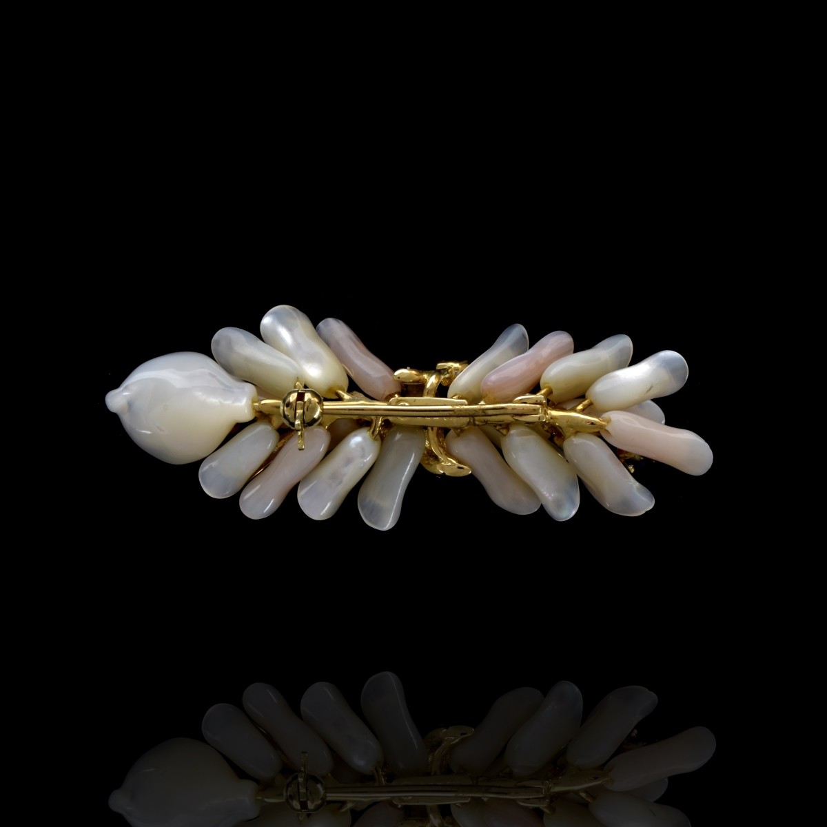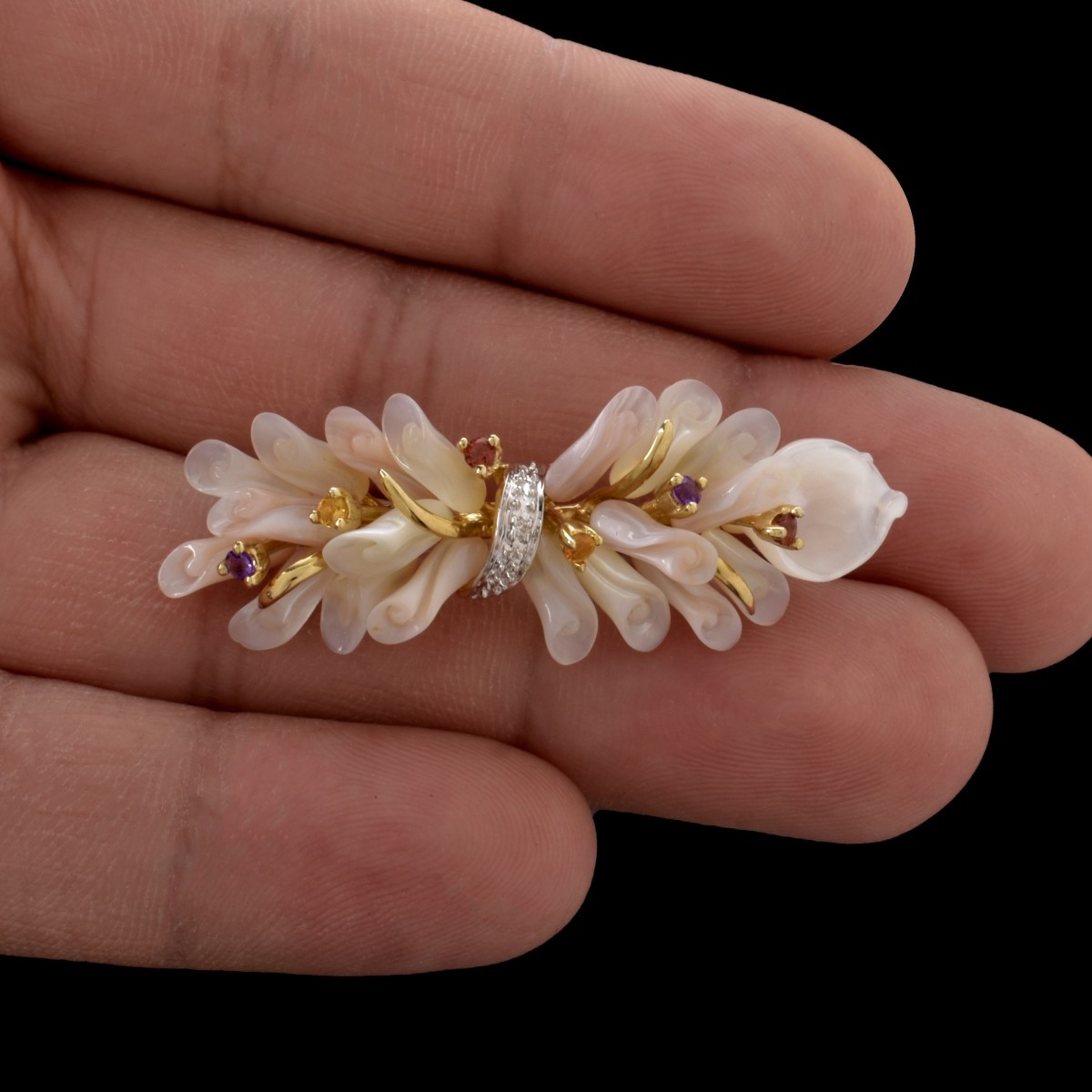 Vintage Carved Mother of Pearl, Gemstone, Diamond and 14 Karat Yellow Gold Brooch. Stamped 14K. Measures 3/4" H, 1-7/8" W. Approx. weight: Condition: Very good vintage condition. Estimate: $200.00 - $300.00 Domestic Shipping: $30.00