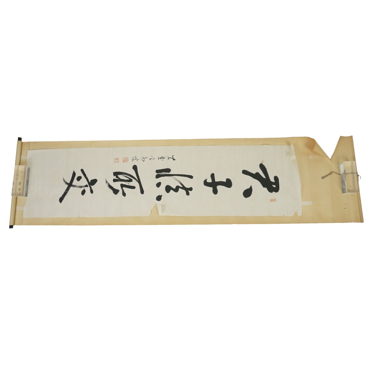 Two 20th Century Chinese Calligraphy Scrolls. Seal signed and calligraphy. One has a silk brocade backing. Largest measures 73" x 16-1/2". Smallest measures 70-1/2" x 17-1/4". Condition: Wear to one scroll. other has some rolling creases otherwise good condition. Estimate: $50.00 - $150.00 Domestic Shipping: $48.00