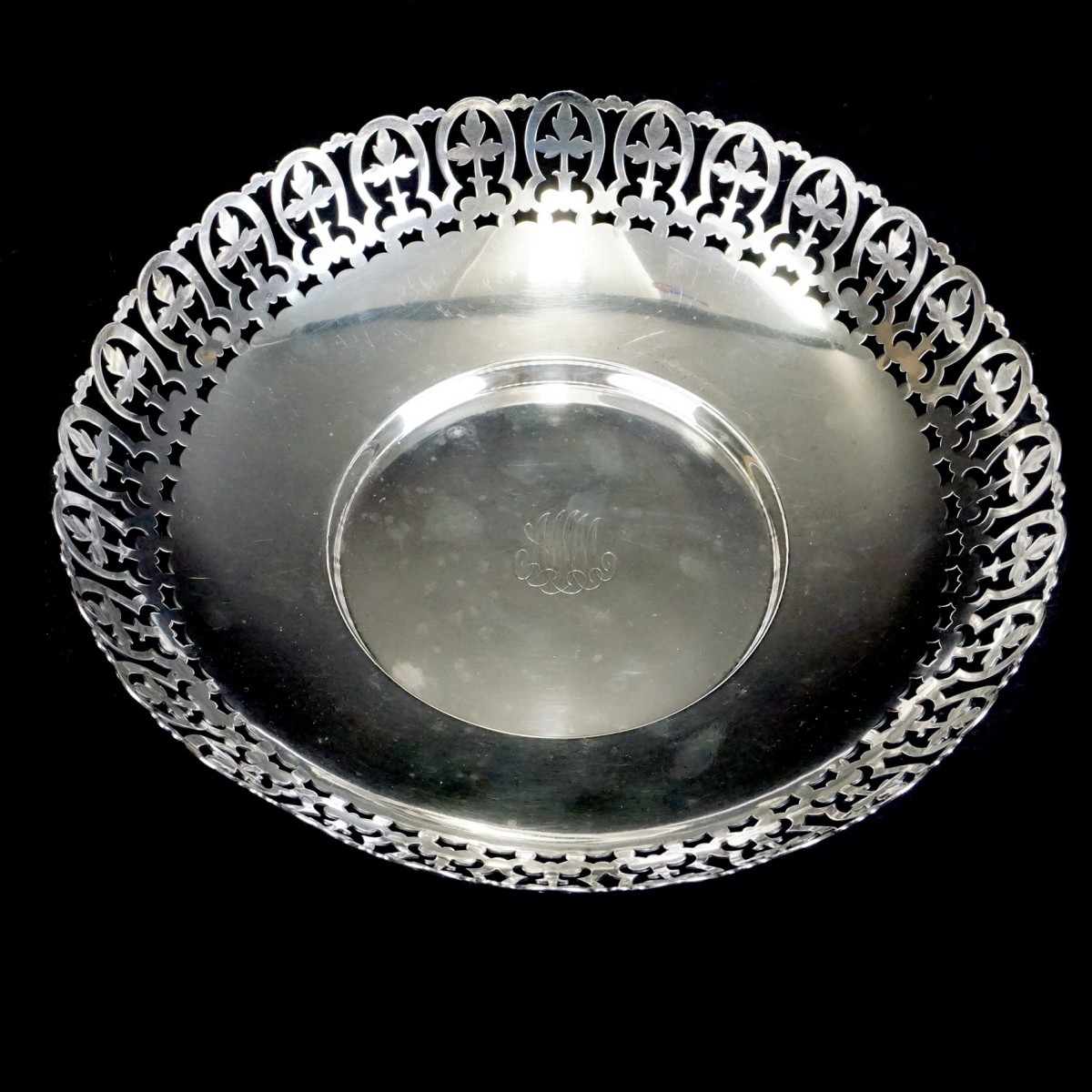 Whiting Manufacturing Co Pierced Sterling Silver Bowl. Stamped and numbered 9115 on the base. Monogrammed en center. Measures 2" x 9". Approx., weight: 9.61 troy ounces. Condition: Good condition. Estimate: $100.00 - $150.00 Domestic Shipping: $55.00
