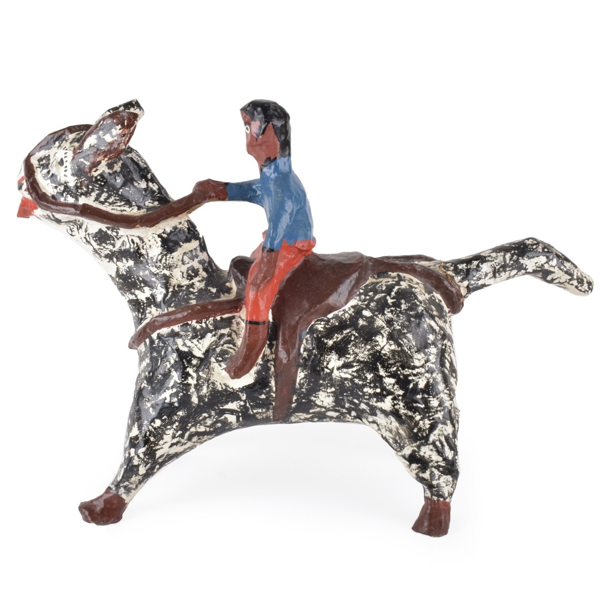 Large Folk Art Hand Painted Papier Mache Figure. Unsigned. Measures 15-1/4" x 22" x 7-1/2". Condition: The tail appears to be repaired otherwise good condition. Estimate: $50.00 - $100.00 Domestic Shipping: Third party
