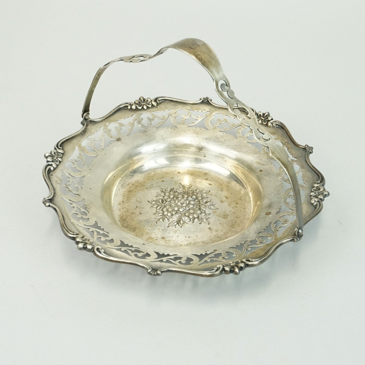 Lot of Two Sterling Silver Table Top Items. Includes a Poole candy dish together with a reticulated basket. Each stamped and numbered. Basket measures 1-1/4" x 7-1/4" (without handle). Candy dish measures 1" x 5-1/2". Approx. weight: 7.29 troy ounces. Condition: Basket needs cleaning otherwise good condition. Estimate: $50.00 - $150.00 Domestic Shipping: $42.00