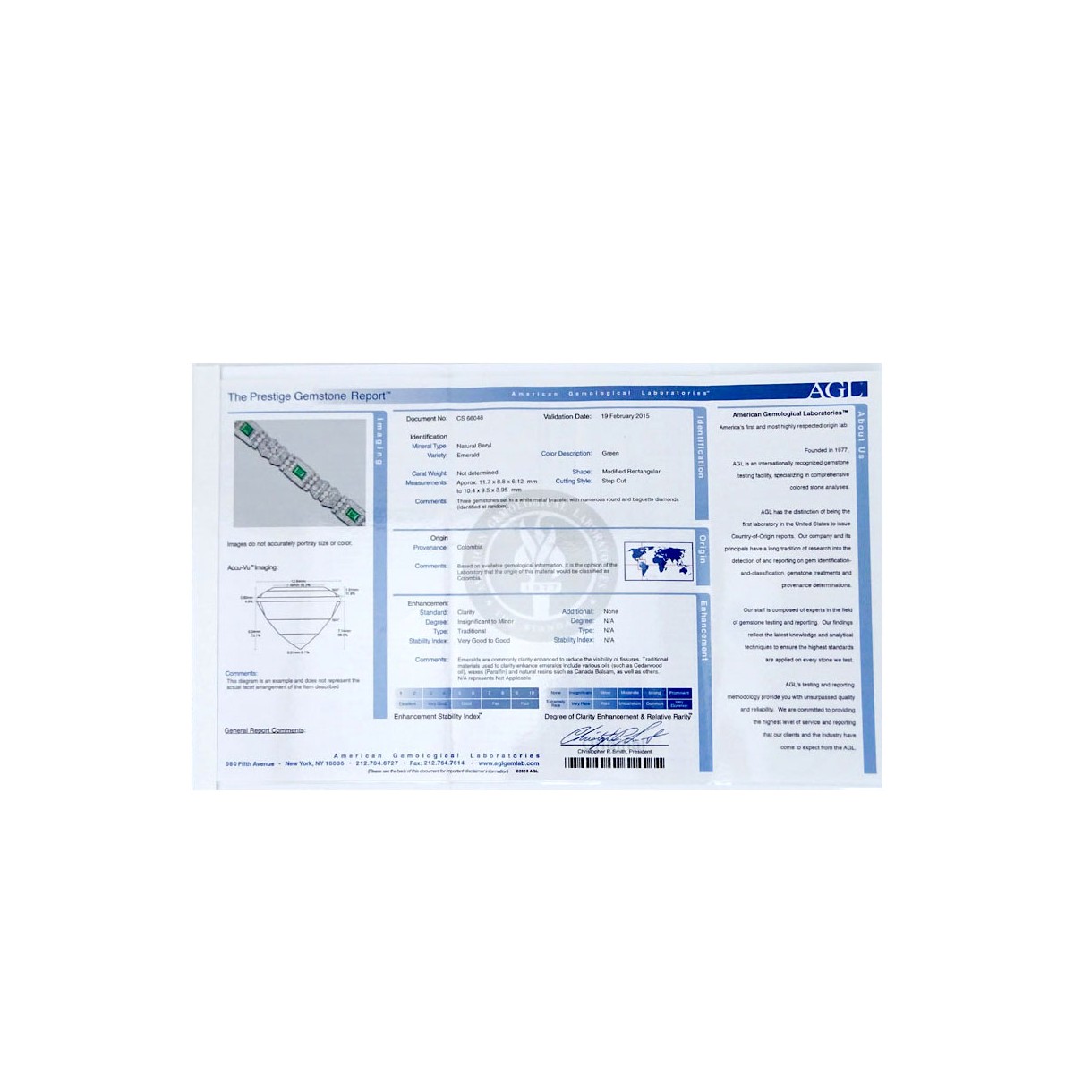 Spectacular French Art Deco Approx. 58.0 Carat Multi Cut Diamond, AGL Certified 12.0 Carat Rectangular Step Cut Colombian Emerald and Platinum Bracelet. Highest quality stones throughout. Diamonds E-F color, VVS-VS clarity. Emeralds with vivid saturation of color. Stamped (indistinctly) to clasp. Very finely made. Measures 7-1/2" L, 3/4" W. Approx. weight: 91.9 grams. AGL Report CS66046 dated 2/15/2015 to accompany this lot. Condition: Very good condition. Please see AGL report for further information Estimate: $150,000.00 - $200.000.00 Domestic Shipping: $36.00