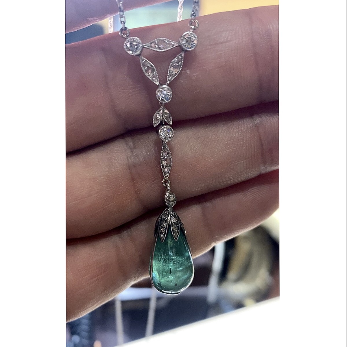 Art Deco Circa 1920s Approx. 3.50 Carat Teardrop Shape Colombian Emerald and 14 Karat White Gold Pendant Necklace. Accented throughout with approx. 1.0 carat TW old European cut diamonds, H color, VS2-SI1 clarity. Necklace measures 16" L. Approx. weight: 8.7 grams. Condition: Very good antique condition. For additional information and/or WhatsApp video please contact our resident GIA Graduate Gemologist, Russ Kodner at 954.650.5030 Estimate: $3000.00 - $5000.00 Domestic Shipping: $30.00