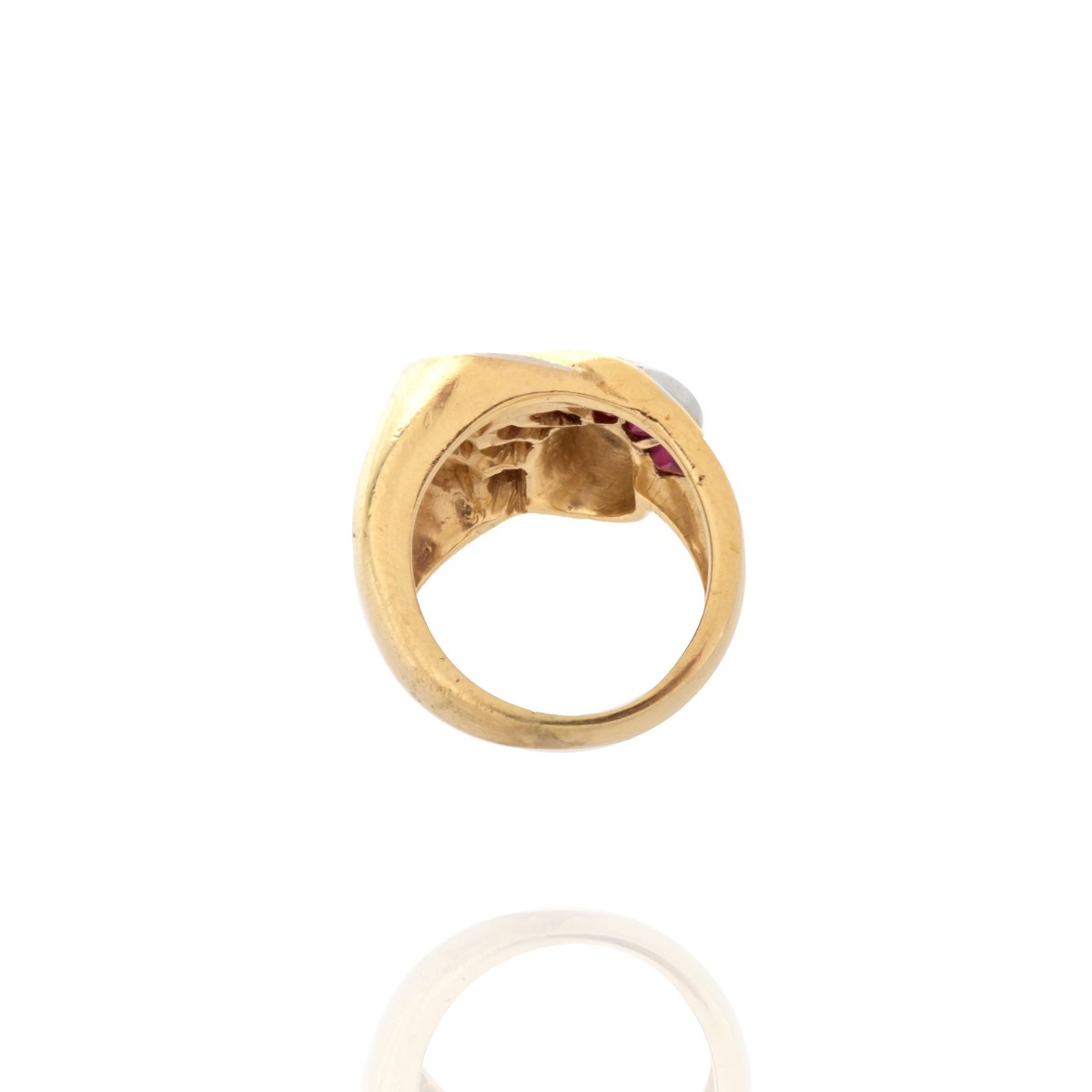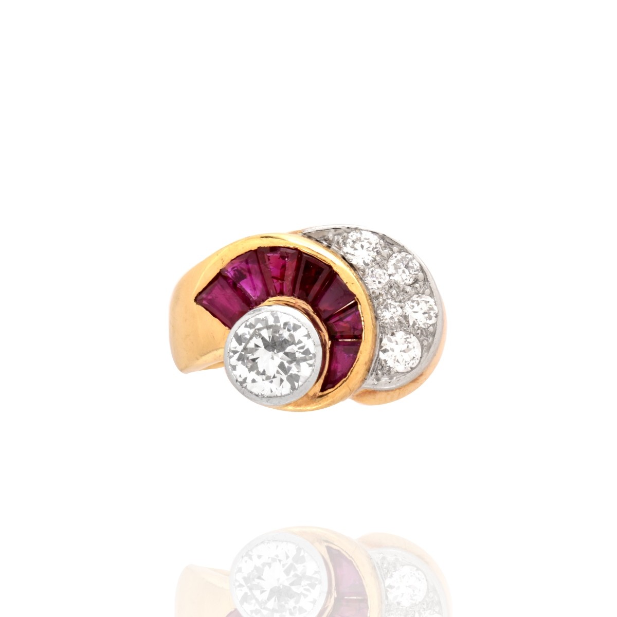 Retro Circa 1940s Approx 1.55 Carat TW Round Brilliant Cut Diamond, 1.20 Carat TW Tapered Baguette Cut Ruby and 14 Karat Yellow Gold Ring. Set in the center with an approx. .90 carat round brilliant cut diamond, H-I color, VS1 clarity. Rubies with vivid color. Stamped 14K. Ring size 3. Approx. weight: 9.72 grams. Condition: Very good vintage condition. For additional information and/or WhatsApp video please contact our resident GIA Graduate Gemologist, Russ Kodner at 954.650.5030 Estimate: $3000.00 - $5000.00 Domestic Shipping: #30.00