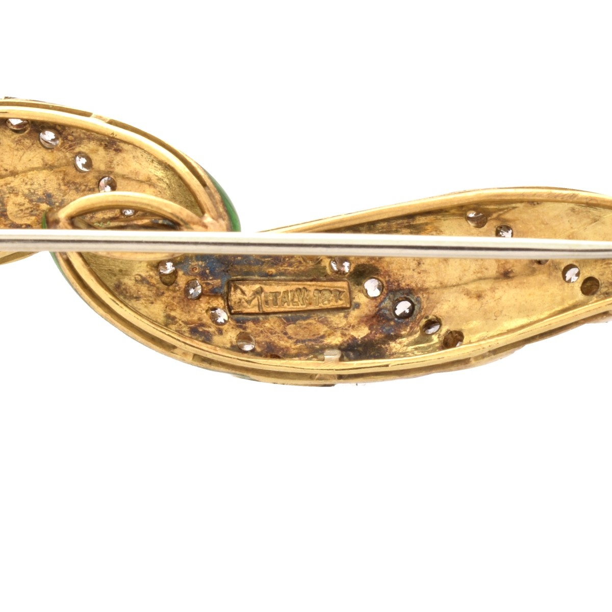 Vintage Italian Approx. 2.0-2.5 Carat TW Thirty Two Round Brilliant Cut Diamond, Guilloche Enamel and 18 Karat Yellow Gold Pin. Diamonds F-G color, VS1-VS2 clarity. Signed M, Italy, 18K. Measures 2-3/8" L, 1/2" W. Approx. weight: 11.21 grams. Condition: Very good vintage condition. Estimate: $800.00 - $1200.00 Domestic Shipping: $30.00