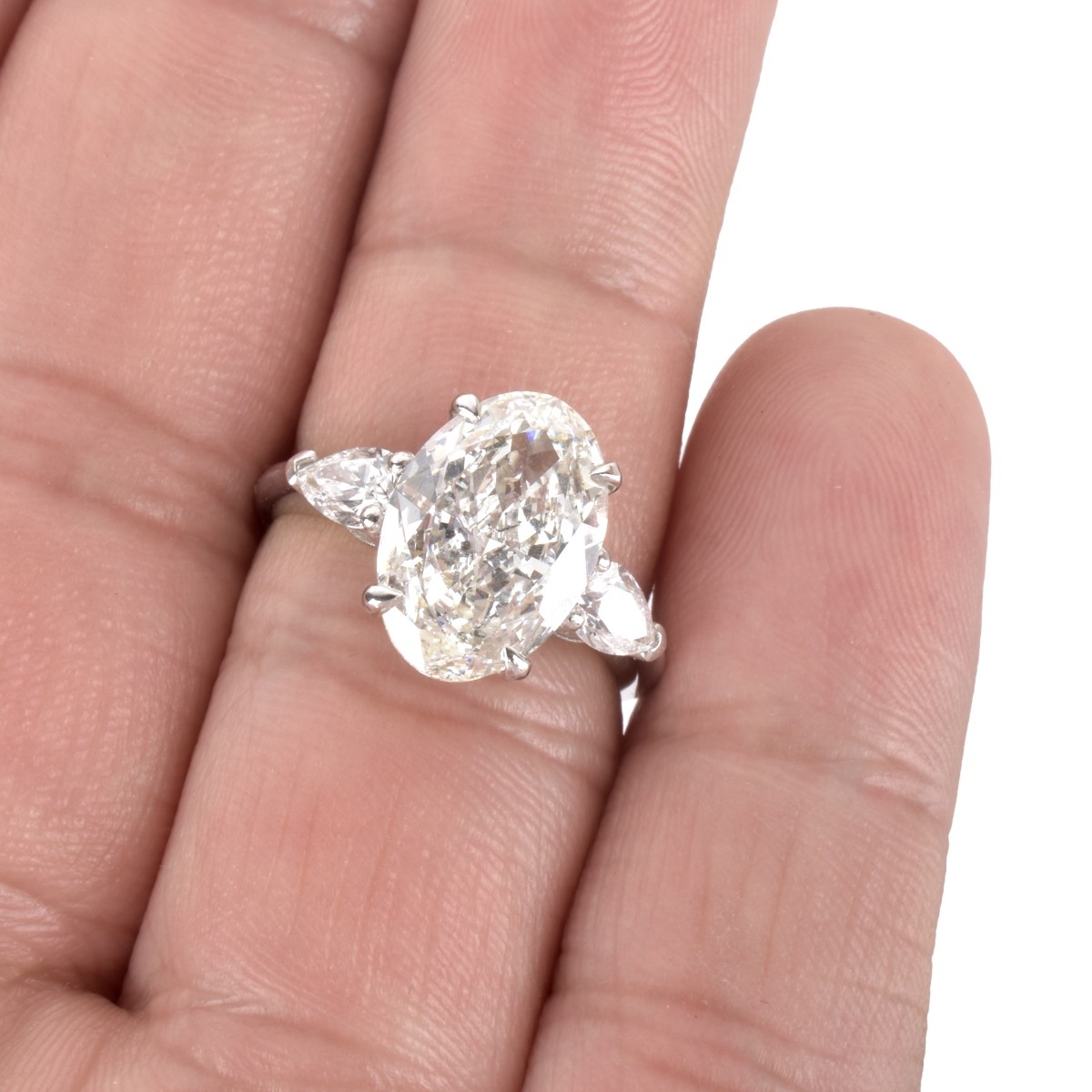 EGL Certified 4.02 Carat Oval Cut Diamond and Platinum Engagement. Ring. Diamond G color, SI2 clarity. Accented with approx. 1.0 carat two pear shape diamonds, E-F color, VS1-VS2 clarity. Stamped Plat. Ring size 6-3/4. Approx. weight: 7.24 grams. EGL Report US 600019802D dated 7/8/2021 to accompany this Lot. Condition: Very good condition. Please refer to EGL report for details. For additional information and/or WhatsApp video please contact our resident GIA Graduate Gemologist, Russ Kodner at 954.650.5030 Estimate: $50,000.00 - $70,000.00 Domestic Shipping: $34.00