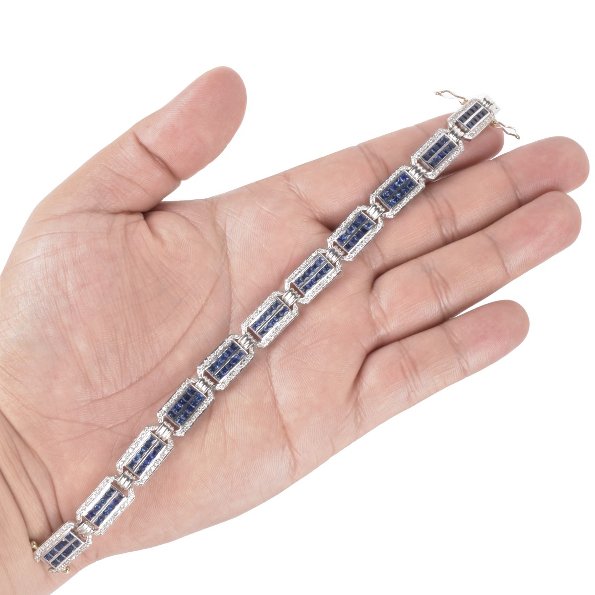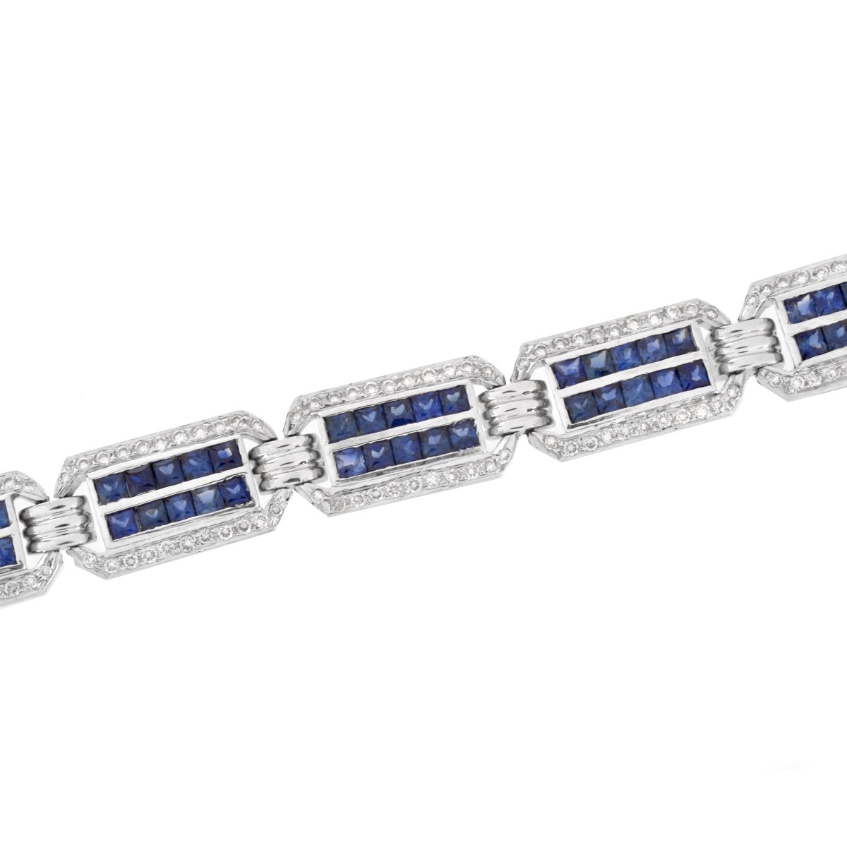 Unisex Approx. 11.0 Carat TW One Hundred Ten Square Cut Sapphire, 3.0 Carat TW Round Brilliant Cut Diamond and 18 Karat White Gold Link Bracelet. Sapphires with vivid saturation of color. Diamonds F-G color, VS1-VS2 clarity. Measures 7-1/2" L, 3/8" W. Approx. weight: 39.67 grams. Condition: Very good condition. For additional information and/or WhatsApp video please contact our resident GIA Graduate Gemologist, Russ Kodner at 954.650.5030 Estimate: $6000.00 - $8000.00 Domestic Shipping: $30.00