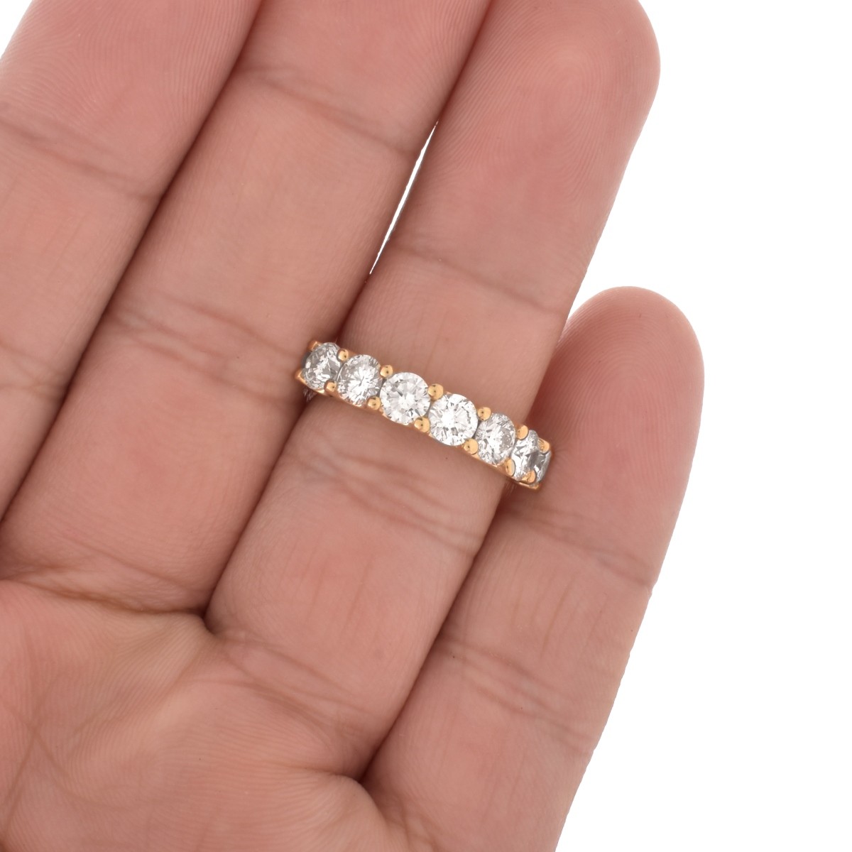 Approx. 2.20 Carat TW Seven Round Brilliant Cut Diamond and 14 Karat Yellow Gold Eternity Band. Diamonds G-H color, VS1-VS2 clarity. Stamped 14K. Ring size 6-1/2. Approx. weight: 4.37 grams. Condition: Very good condition. For additional information and/or WhatsApp video please contact our resident GIA Graduate Gemologist, Russ Kodner at 954.650.5030 Estimate: $4000.00 - $6000.00 Domestic Shipping: $30.00