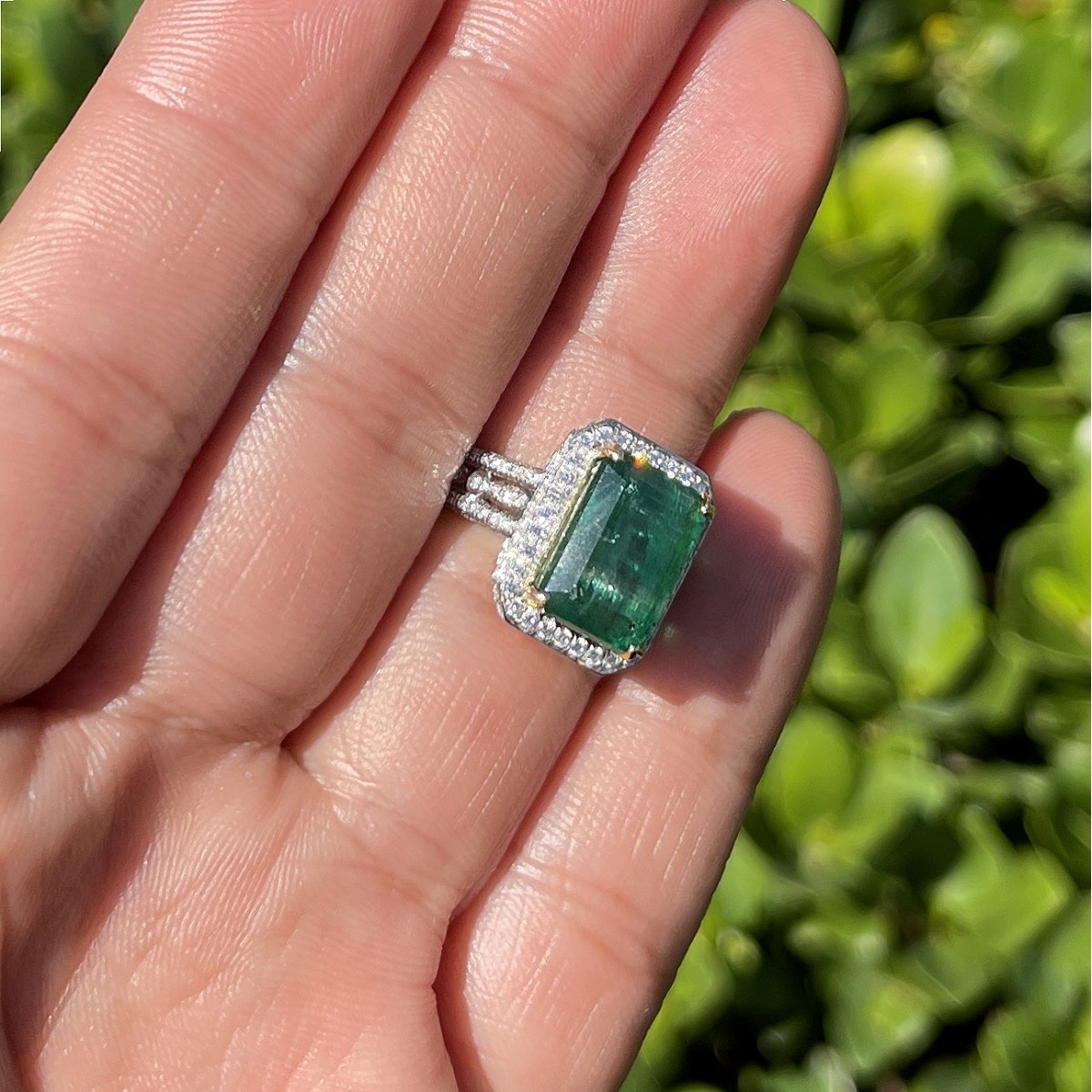 Approx. 8.1 Carat Zambian Emerald, 2.20 Carat TW Two Hundred Fifty Four Round Brilliant Cut Diamond and 18 Karat White and Yellow Gold Ring. Emerald with vivid color, measures12.3 x 9.0mm. Diamonds F-G color, VS1-VS2 clarity. Stamped 18K. Ring size 7. Approx. weight: 7.4 grams. Condition: Very good condition. For additional information and/or WhatsApp video please contact our resident GIA Graduate Gemologist, Russ Kodner at 954.650.5030 Estimate: $5000.00 - $7000.00 Domestic Shipping: 28.00