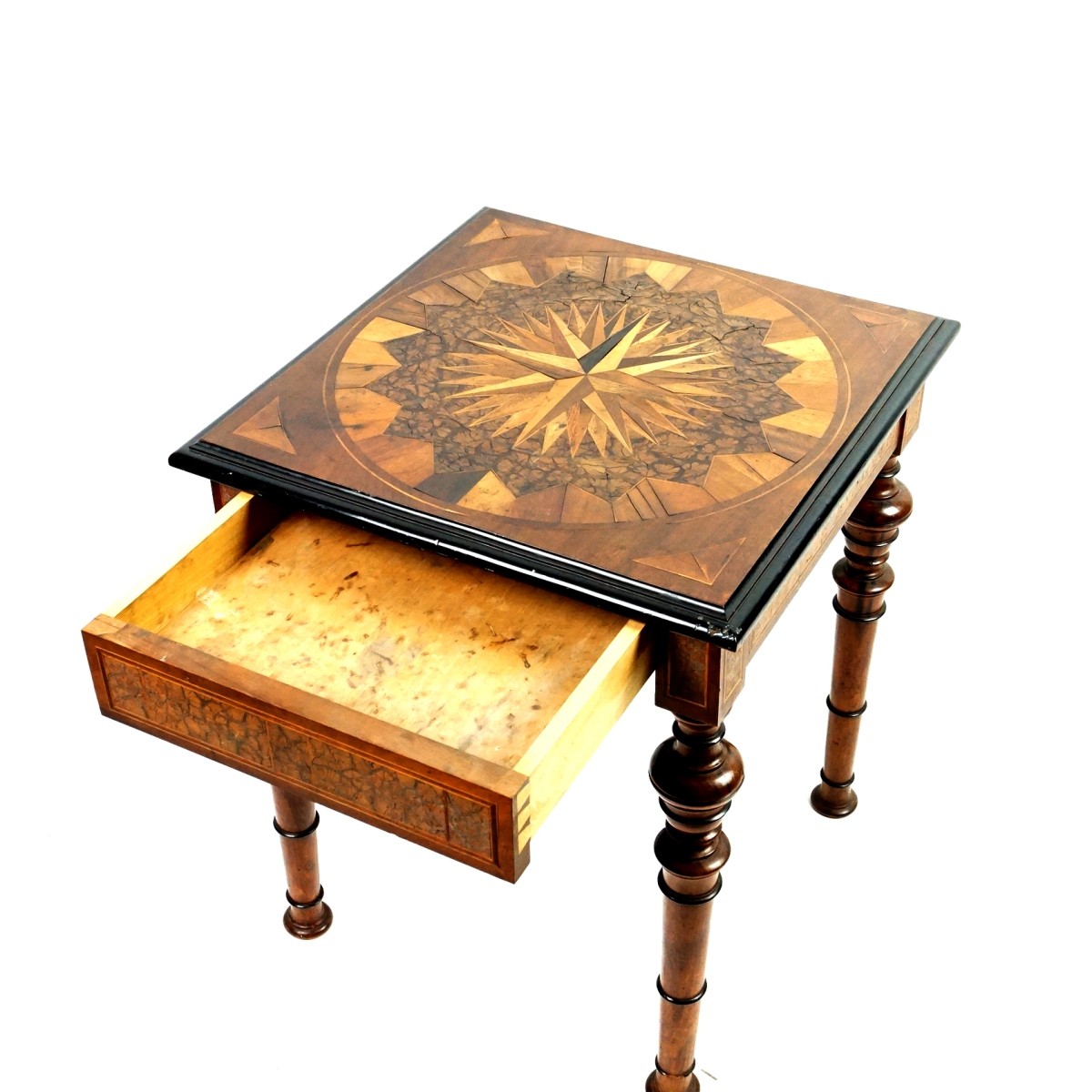 20th Century Italian Neoclassical Ebonized Side Table with Marquetry Inlaid Top. Single sliding drawer. Measures 24" x 19-3/8" x 19-5/8". Condition: Wear to one corner, normal surface rubbing otherwise good condition. Estimate: $100.00 - $300.00 Domestic Shipping: Third party