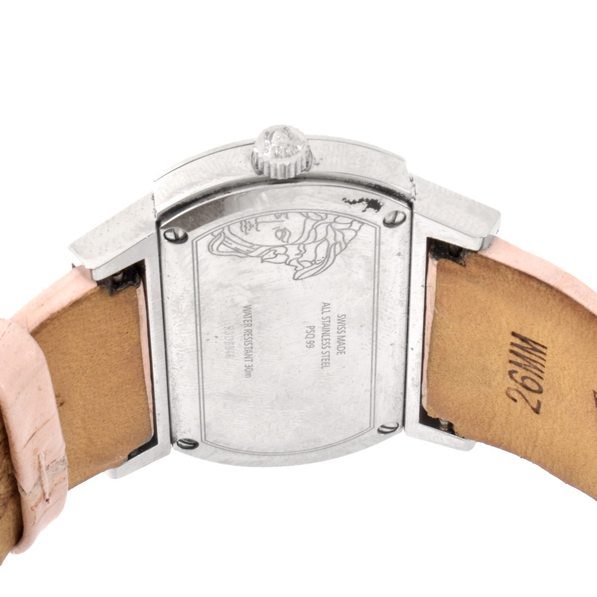 Lady's Vintage Versace Stainless Steel Watch with Pink Mother of Pearl Dial, Pink Leather Strap. Quartz movement. Case measures 35 x 41mm. No box, no papers. Condition: Very good pre-owned condition. Light surface wear. Wear to strap. Likely needs a battery. Please note the gallery does not warranty the running condition of watches. Estimate: $300.00 - $500.00 Domestic Shipping: $34.00