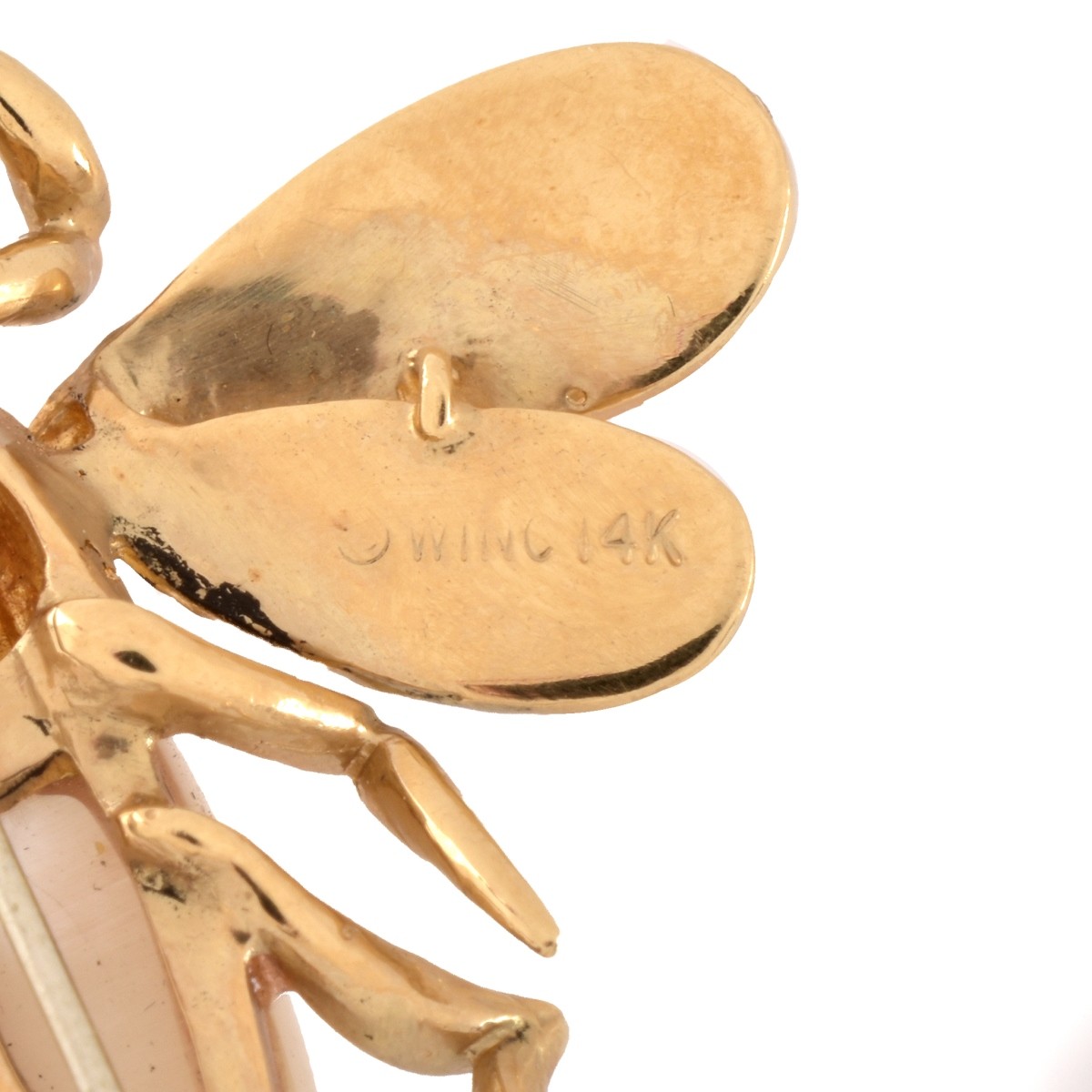 Vintage Robert Wander 14 Karat Yellow Gold and Mother of Pearl Bee Brooch. Signed WINC 14K. Measures 1-3/8" L, 1-5/8" W. Approx. weight: 13.26 grams. Condition: Very good condition. Estimate: $300.00 - $500.00 Domestic Shipping: $30.00