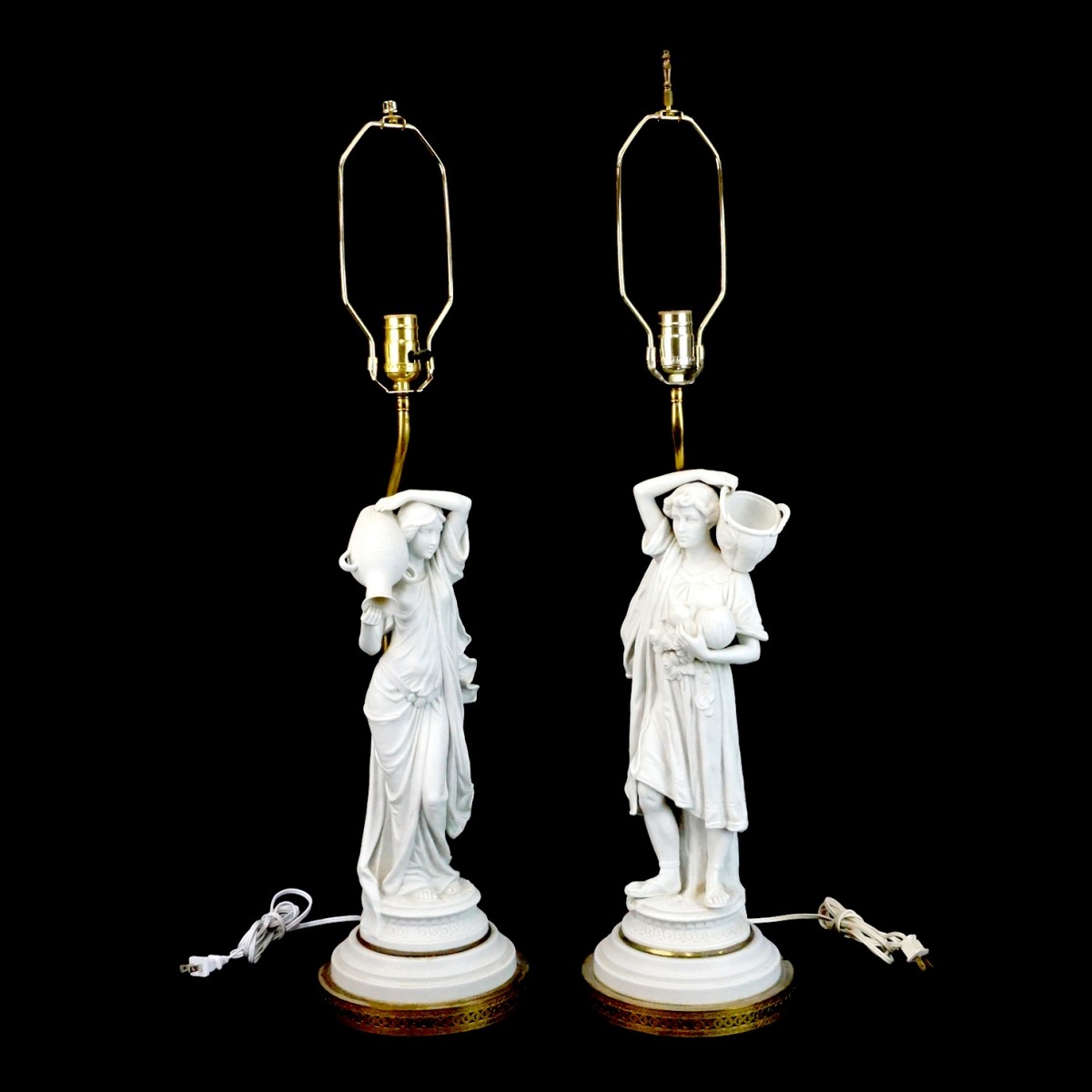 Pair of Vintage Neoclassical Style Porcelain Figural Lamps. Unsigned. Figures measures 17-1/4" x 5" x 4-1/4". Overall measures 34" x 8". Condition: Good condition. Needs cleaning. Estimate: $100.00 - $200.00 Domestic Shipping: Third party