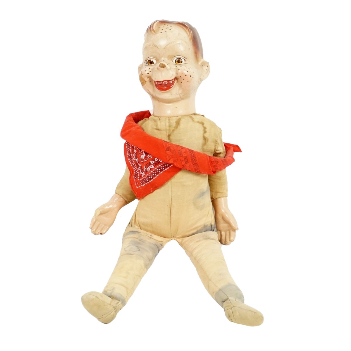 Vintage Howdy Doody Doll with Moving Eyes. Measures 20". Condition: Head has some wear, body stains, no clothing. Right hand has a loss to the thumb. Estimate: $50.00 - $150.00 Domestic Shipping: $48.00