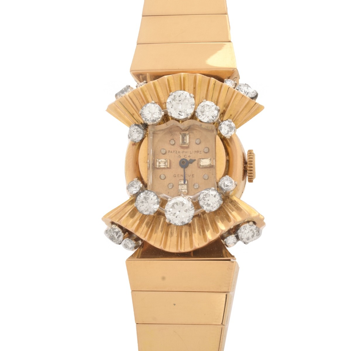 Lady's Retro Patek Philippe Eighteen Round Brilliant Cut Diamond and 18 Karat Yellow Gold Bracelet Watch. Manual wind movement. Case measures 20mm. Diamonds F-G color, VS-SI clarity. Bracelet measures 7-1/2" L. Illegible hallmarks to clasp. Approx. weight: 77.09 grams. Condition: Very good vintage condition. Appears to need servicing. Will not wind. Please note the gallery does not warranty the running condition of watches. For additional information and/or WhatsApp video please contact our resident GIA Graduate Gemologist, Russ Kodner at 954.650.5030 Estimate: $15,000.00 - $20,000.00 Domestic Shipping: $32.00