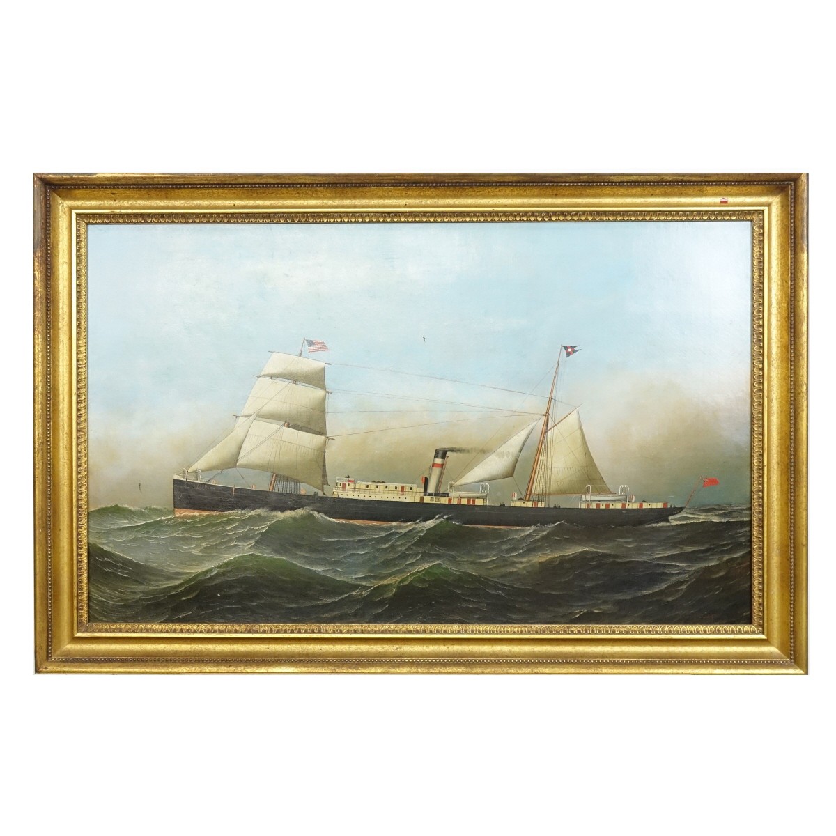 Antonio Jacobsen, Danish (1850 - 1921) Oil on Canvas "S.S. Alene" Signed Lower Left. Artist information attached en verso. Measures 22" x 36", frame measures 26-1/2" x 40-1/2". Condition: Very good conserved condition. Craquelure, very small area with paint loss, some yellowing. Estimate: $8000.00 - $15000.00 Domestic Shipping: Third party