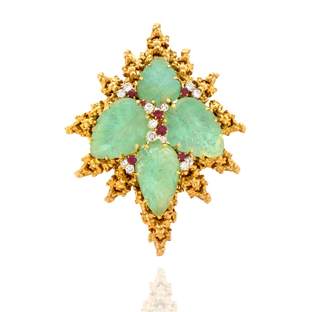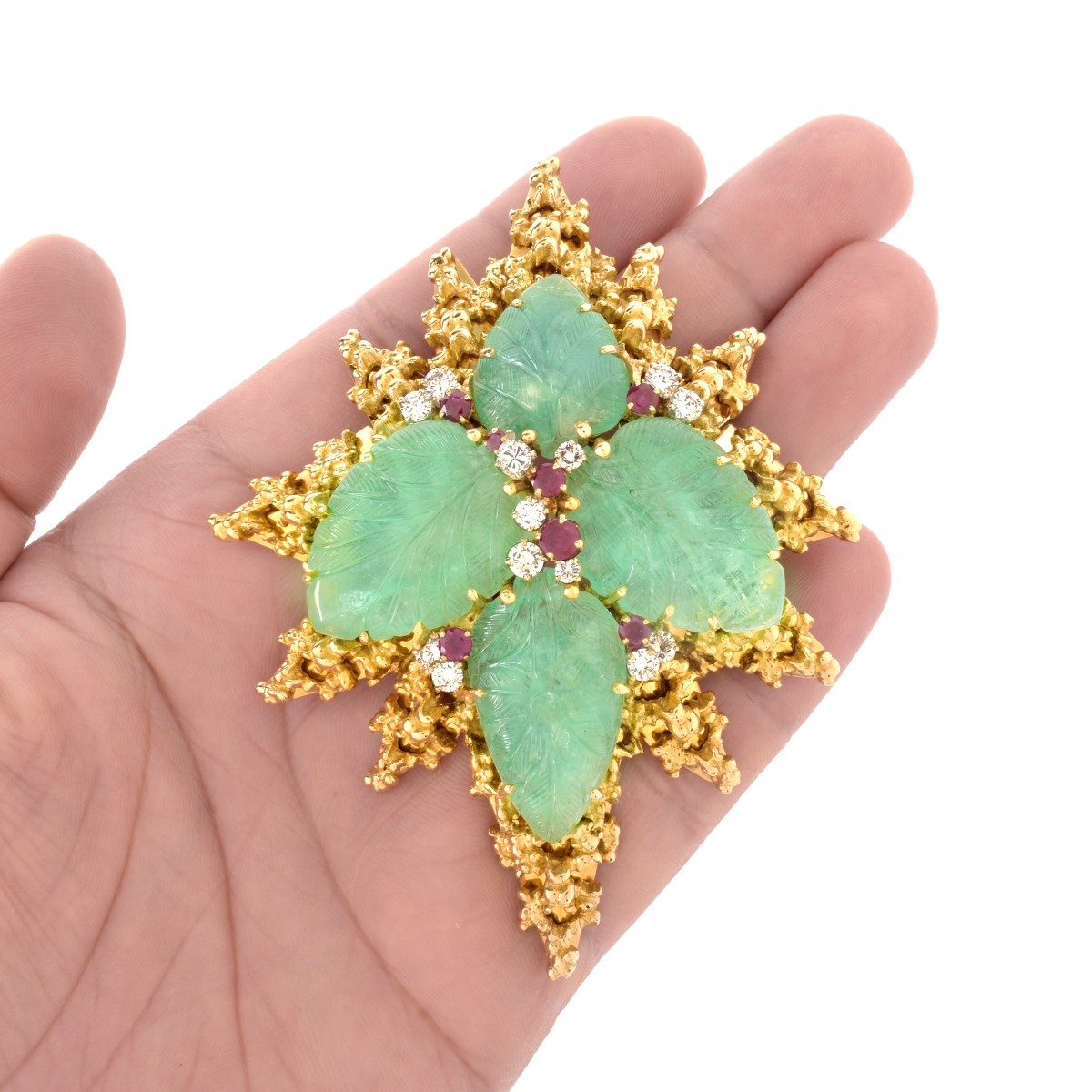 Large Vintage French Approx. 125.00 Carat TW Four Carved Emerald, 1.10 Carat TW Seven Round Cut Burma Ruby, 2.50 Carat TW Thirteen Round Brilliant Cut Diamond and 18 Karat Yellow Gold Pendant / Brooch. Rubies with vivid saturation of color. Diamonds F-G color, VVS-VS clarity. Stamped with French 18K hallmark (eagle head). Measures 3-3/4" H, 2-3/4" W. Approx. weight: 92.60 grams. Condition: Very good pre-owned condition. For additional information and/or WhatsApp video please contact our resident GIA Graduate Gemologist, Russ Kodner at 954.650.5030 Estimate: $12,000.00 - $15,000.00 Domestic Shipping: $36.00