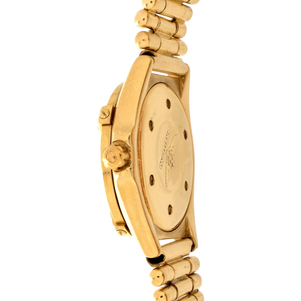Lady's Vintage Breitling 18 Karat Yellow Gold Bracelet Watch. Quartz movement. Case measures 27.5mm. Stamped 750. Bracelet measures 6-1/2" L. Approx. weight: 101.11 grams. Condition: Very good pre-owned condition. Appears to need a battery. Please note the gallery does not warranty the running condition of watches. For additional information and/or WhatsApp video please contact our resident GIA Graduate Gemologist, Russ Kodner at 954.650.5030 Estimate: $6000.00 - $8000.00 Domestic Shipping: $34.00