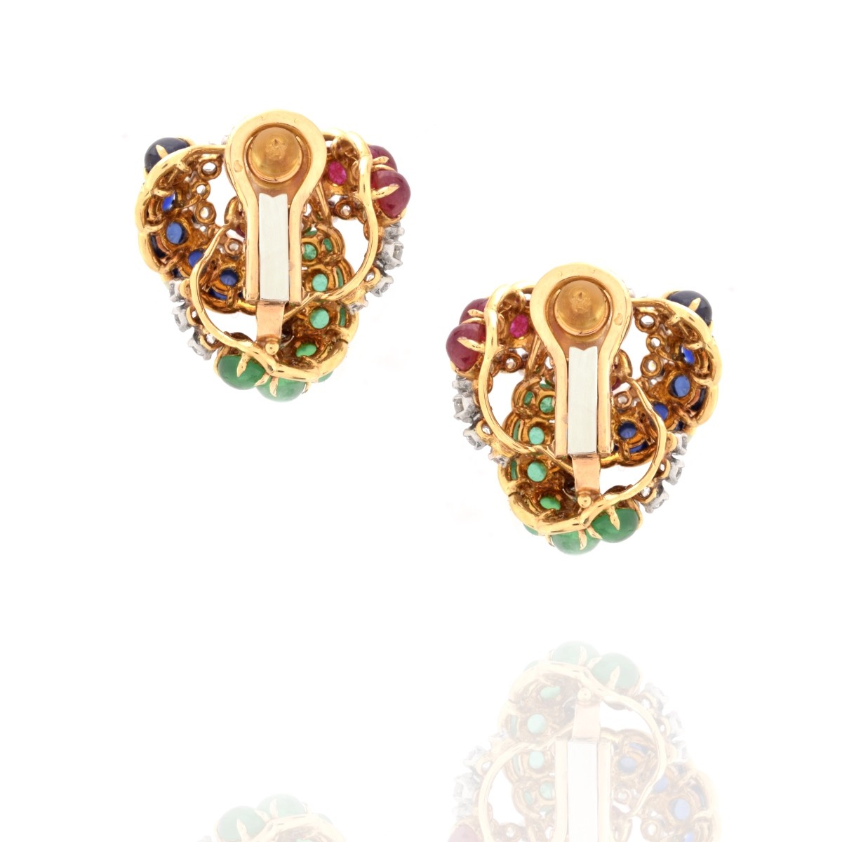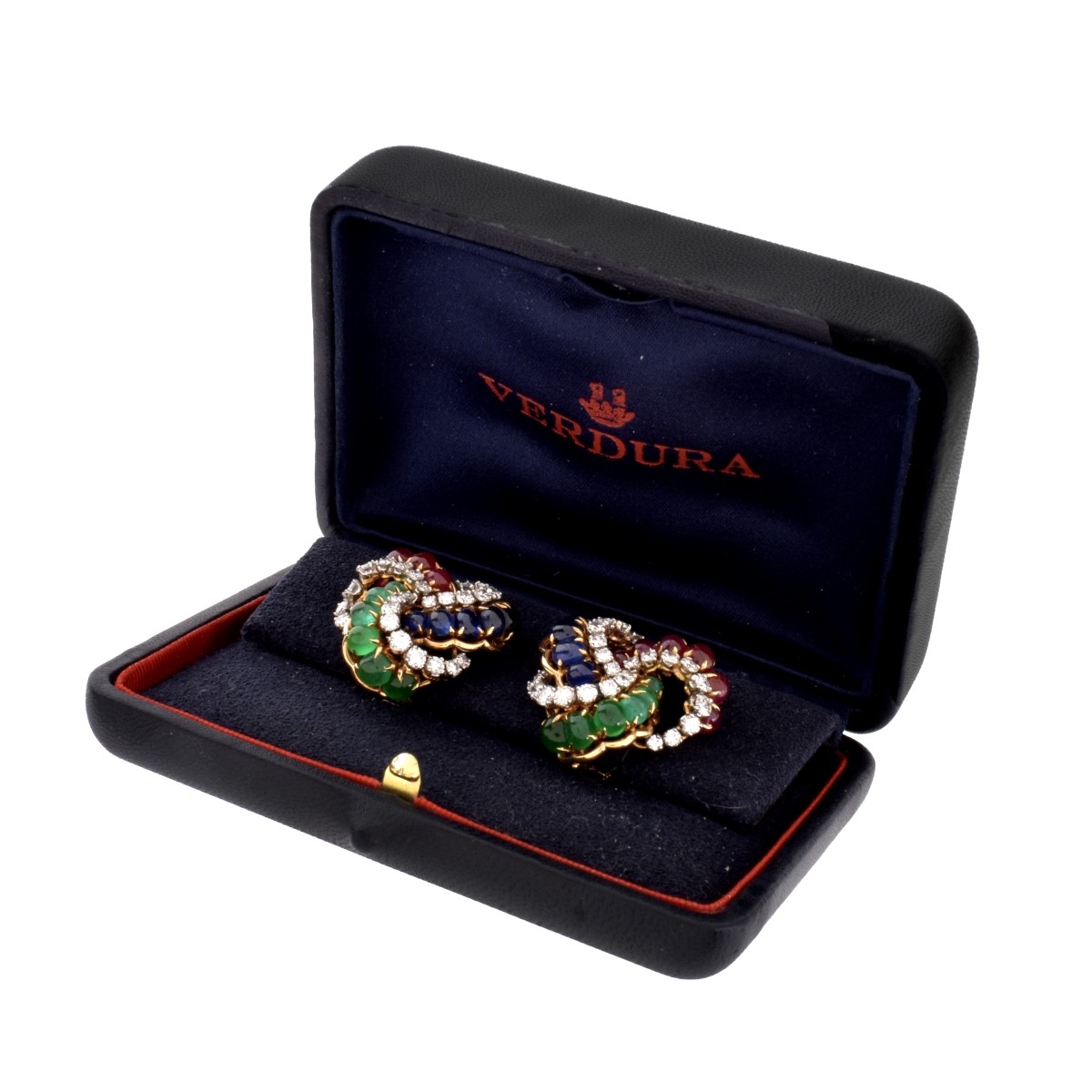 Vintage Verdura Paris Gemstone, Diamond, Platinum and 18 Karat Yellow Gold "Trinacria" Ear Clips. Set with 12 oval cabochon emeralds, 12 oval cabochon rubies, 12 oval cabochon sapphires and 54 round brilliant cut diamonds. Gem quality stones throughout. Stamped with French 18K hallmark (eagle head). Measure 1" diam. Approx. weight: 27.39 grams. Accompanied by Verdura box and Verdura 745 Fifth Ave., New York retail value appraisal dated 1/21/2021 of $56,500.00 Condition: Very good condition. For additional information and/or WhatsApp video please contact our resident GIA Graduate Gemologist, Russ Kodner at 954.650.5030 Estimate: $20.000.00 - $30,000.00 Domestic Shipping: $42.00