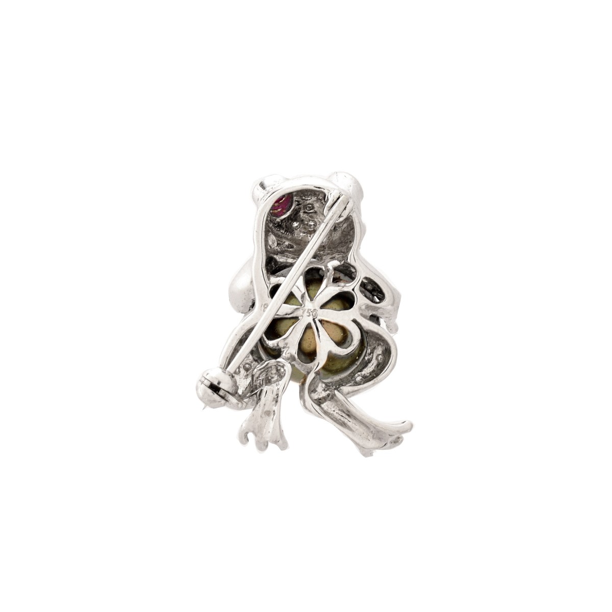 Vintage 11.0mm Tahitian Black Pearl, Pave Set Diamond and 18 Karat White Gold Frog Brooch Set with Cabochon Ruby Eyes. Pearl with good luster and polish. Stamped 18K. Measures 1" H, 3/4" W. Approx. weight: 8.44 grams. Condition: Very good condition. Estimate: $500.00 - $1000.00 Domestic Shipping: $28.00