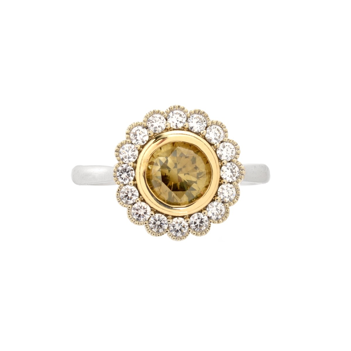 EGL Certified 1.01 Carat Round Brilliant Cut Natural Fancy Deep Brownish Yellow Diamond, .75 Carat TW Round Brilliant Cut Diamond and 18 Karat White and Yellow Gold Ring. Yellow diamond SI2 clarity. Accent diamonds G-H color, VS1-VS2 clarity. Stamped 18K. Ring size 8. Approx. weight: 4.45 grams. Copy of EGL Report US 59041001D dated 9/23/2011 to accompany this Lot. Condition: Very good condition. For additional information and/or WhatsApp video please contact our resident GIA Graduate Gemologist, Russ Kodner at 954.650.5030 Estimate: $3500.00 - $5000.00 Domestic Shipping: $38.00