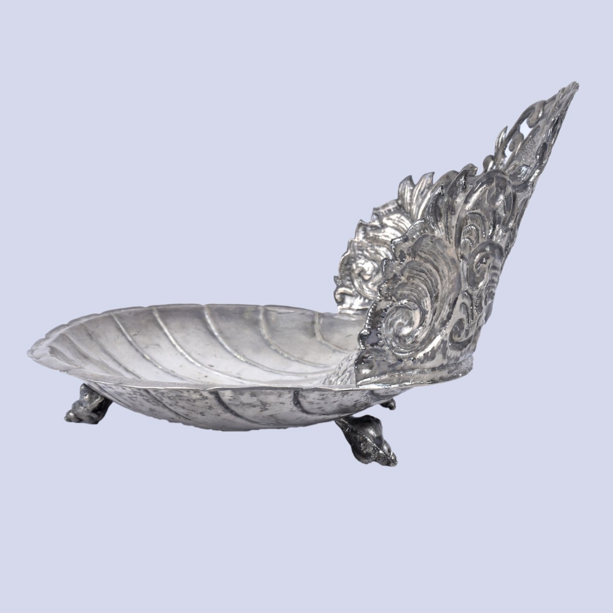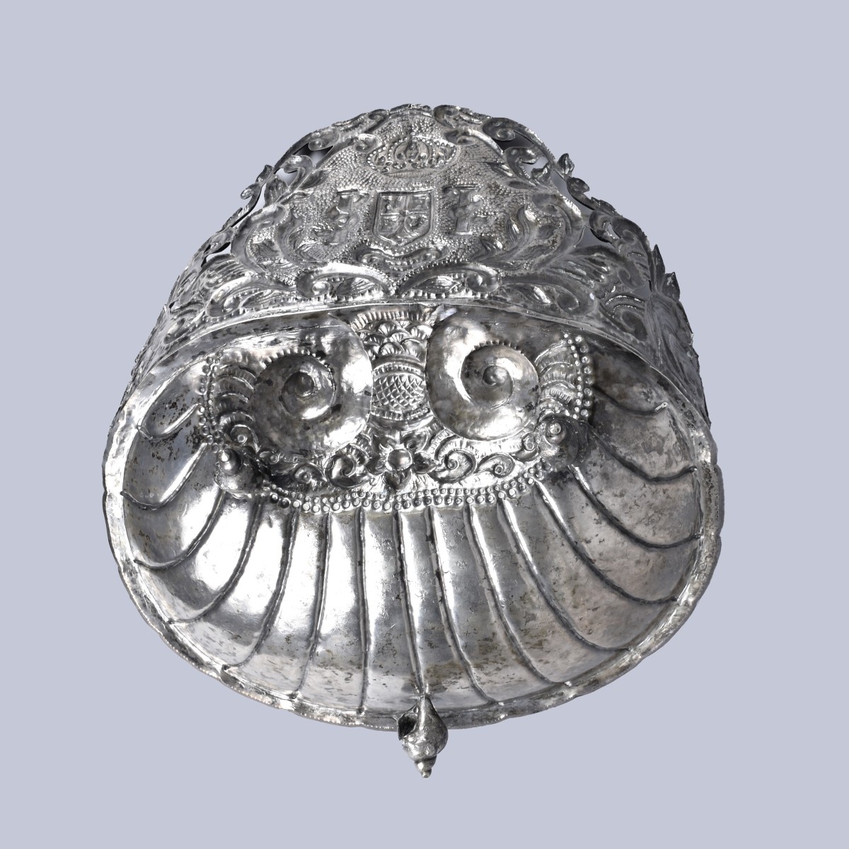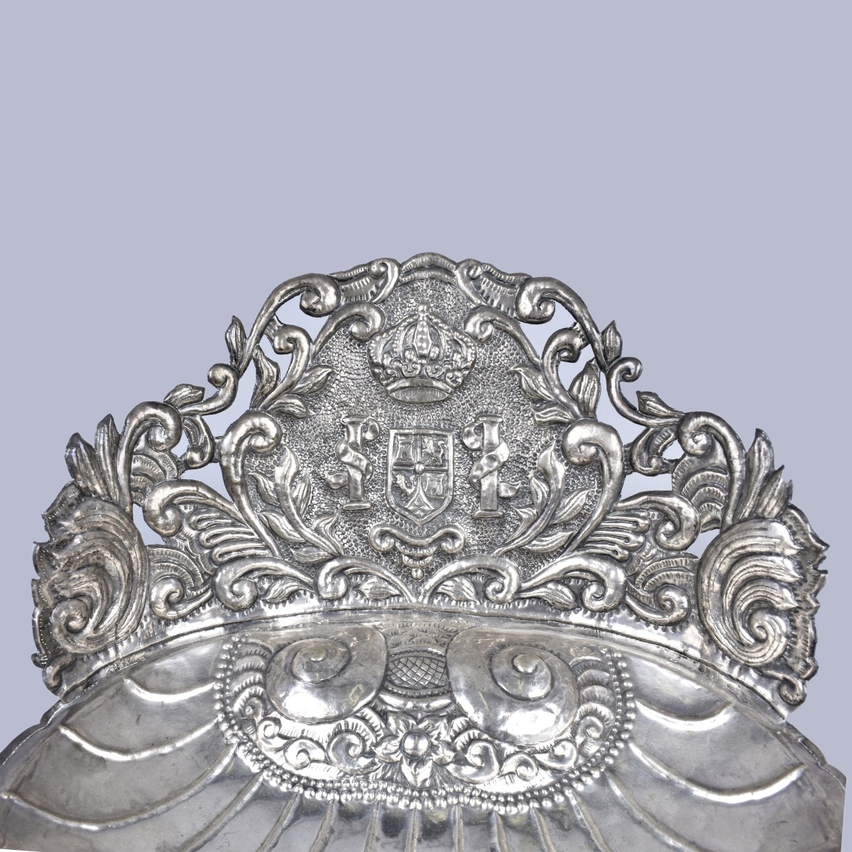 18/19th Century Spanish Colonial Repousse Holy Water / Baptism Dish. Coat of arms motif on the back splash. Unmarked. Measures 9-7/8" x 14-5/8" x 14". Approx. weight: 40.83 troy ounces. Condition: Good antique condition. Estimate: $2000.00 - $4000.00 Domestic Shipping: Third party