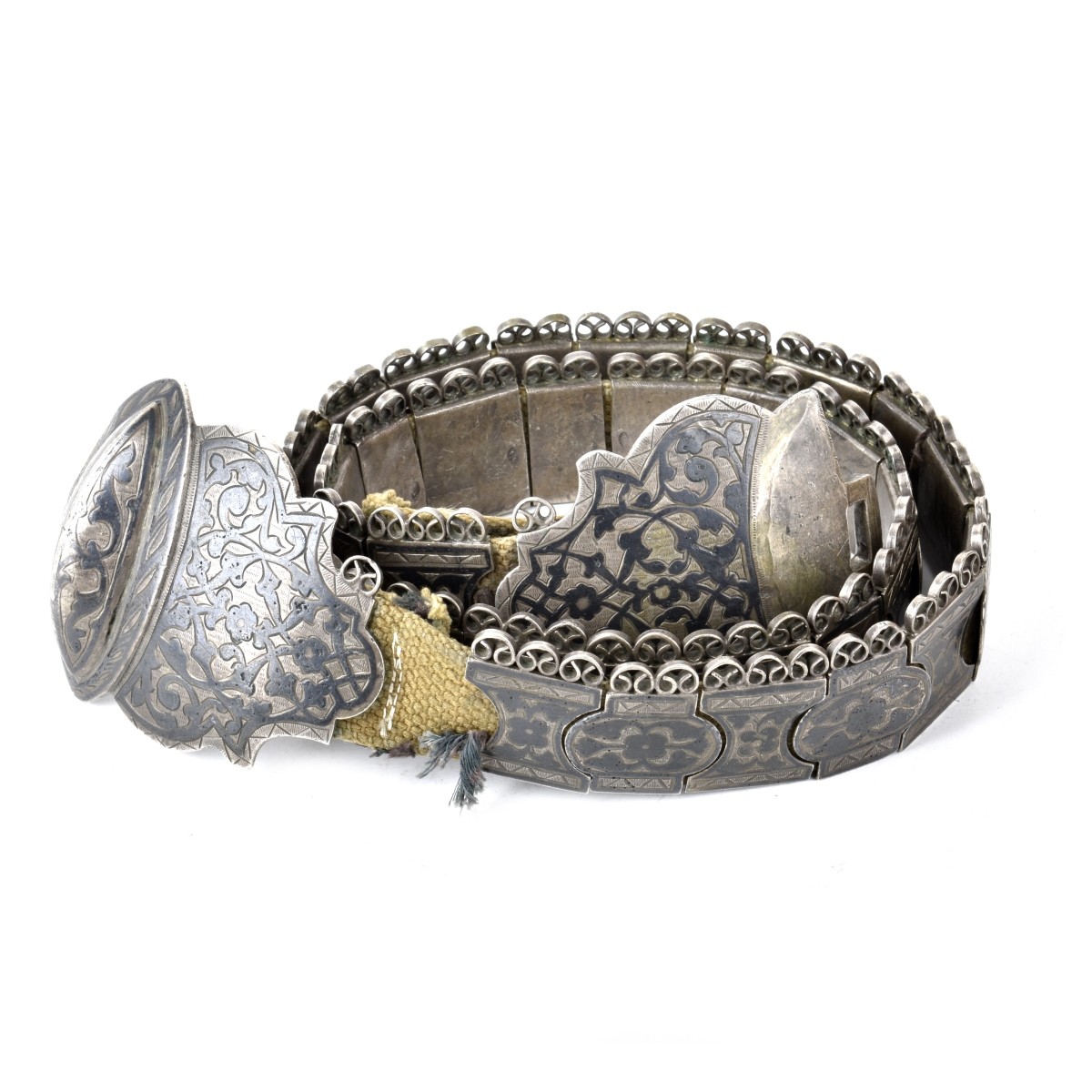 Antique Russian Silver Belt. Russian 84 silver mark. Measures 31-1/4" L, 2-3/8" W (at clasp). Approx. weight: 496.47 grams. Condition: Good antique condition. Estimate: $800.00 - $1200.00 Domestic Shipping: $48.00