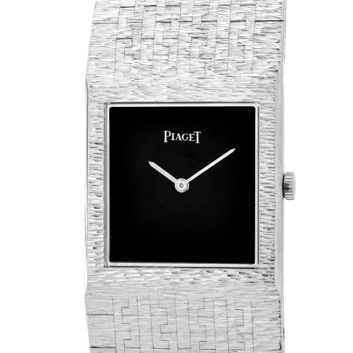 Vintage Piaget 18 Karat White Gold Integrated Bracelet Watch with Black Onyx Dial. Manual wind movement. Measures 6-3/4" L, 7/8" W. Approx. weight: 86.30 grams. Condition: Very good vintage condition. Running. Please note the gallery does not warranty the running condition of watches. For additional information and/or WhatsApp video please contact our resident GIA Graduate Gemologist, Russ Kodner at 954.650.5030 Estimate: $6000.00 - $8000.00 Domestic Shipping: $38.00