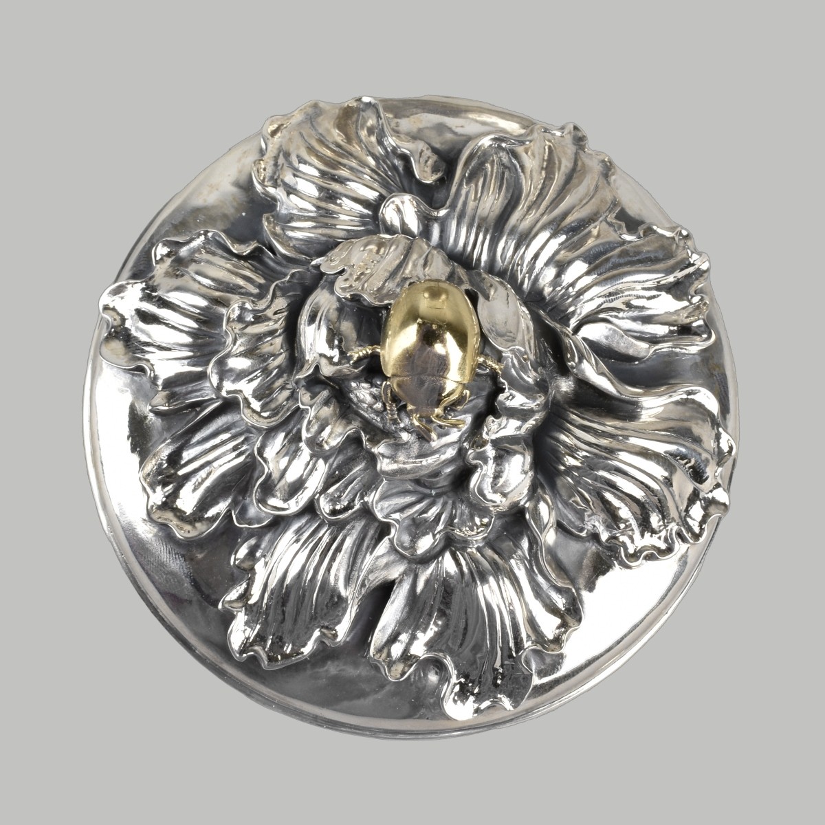 Fine Japanese Repousse Silver Teapot with Chrysanthemums and Vermeil Lady Bug Finial. Bears a makers mark seal signature on the base. Overall height: 9-1/4". Actual measurements 6-1/2" x 6-1/4" x 6-1/4". Approx. weight: 19.28 troy ounces. Condition: Good condition. Estimate: $400.00 - $600.00 Domestic Shipping: $72.00