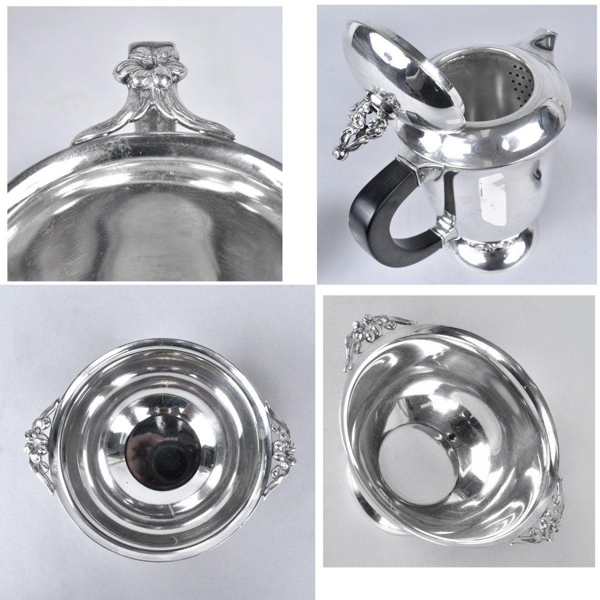 Mueck Carey Co. Sterling Silver 3-Piece Tea Set. Stamped and numbered 1116 on the base. Lot includes a tea pot with wooden handle, creamer, and open sugar. Tea pot measures 10" x 8-1/8" x 4-3/4". Creamer measures 3-1/4" x 3" x 4-1/4". Approx. weight: 29.47 troy ounces. Condition: Good condition. Estimate: $800.00 - $1000.00 Domestic Shipping: $72.00