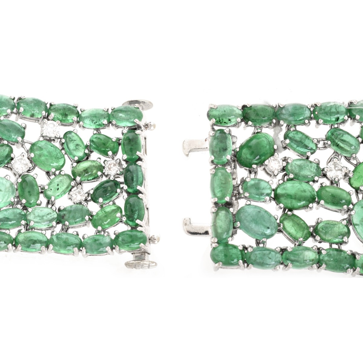 Approx. 57.50 Carat TW Oval Cabochon Emerald, 5.60 Carat TW Round Brilliant Cut Diamond and 18 Karat White Gold Wide Flexible Link Bracelet. Emeralds with vivid color and good clarity. Diamonds F-G color, VS1-VS2 clarity. Measures 7-1/4" L, 1-1/8" W. Approx. weight: 76.55 grams. Condition: Very good condition. For additional information and/or WhatsApp video please contact our resident GIA Graduate Gemologist, Russ Kodner at 954.650.5030 Estimate: $25,000.00 - $30,000.00 Domestic Shipping: $38.00