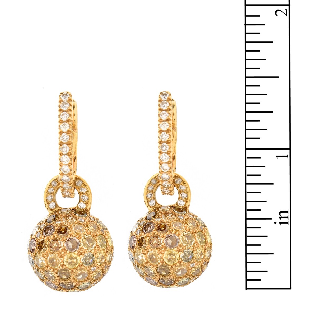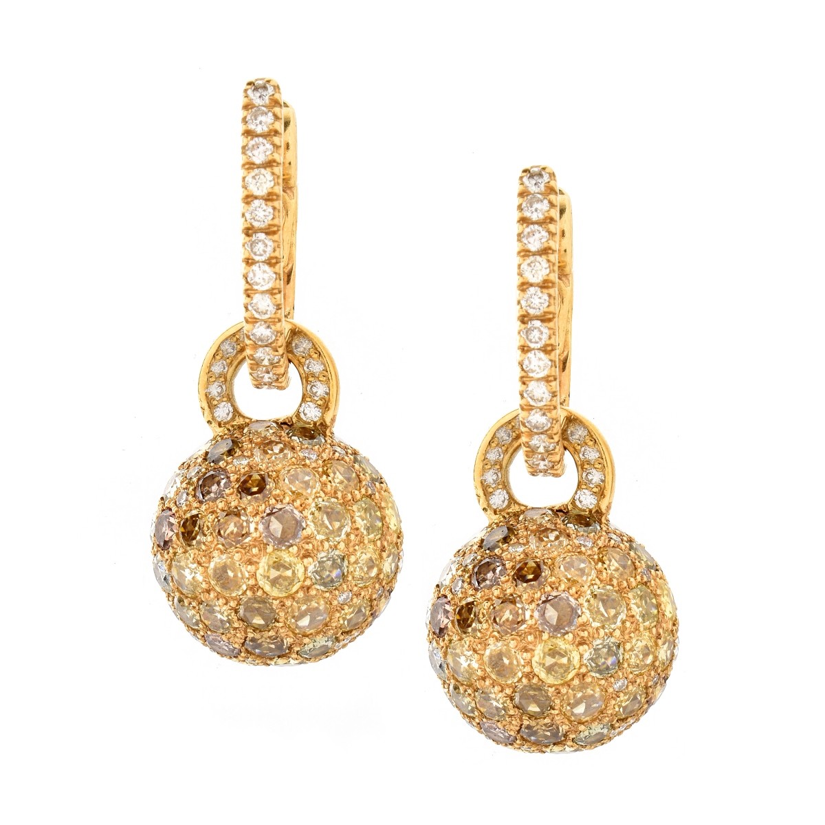 Approx. 12.0 Carat TW Pave Set Round Brilliant Cut Natural Fancy Multi Color Diamond and 18 Karat Yellow Gold Dangle Ball Earrings. Diamonds with good color, VS clarity. Measure 1-1/8" L, 9/16" W. Approx. total weight: 14.02 grams. Condition: Very good condition. For additional information and/or WhatsApp video please contact our resident GIA Graduate Gemologist, Russ Kodner at 954.650.5030 Estimate: $9000.00 - $12,000.00 Domestic Shipping: $36.00