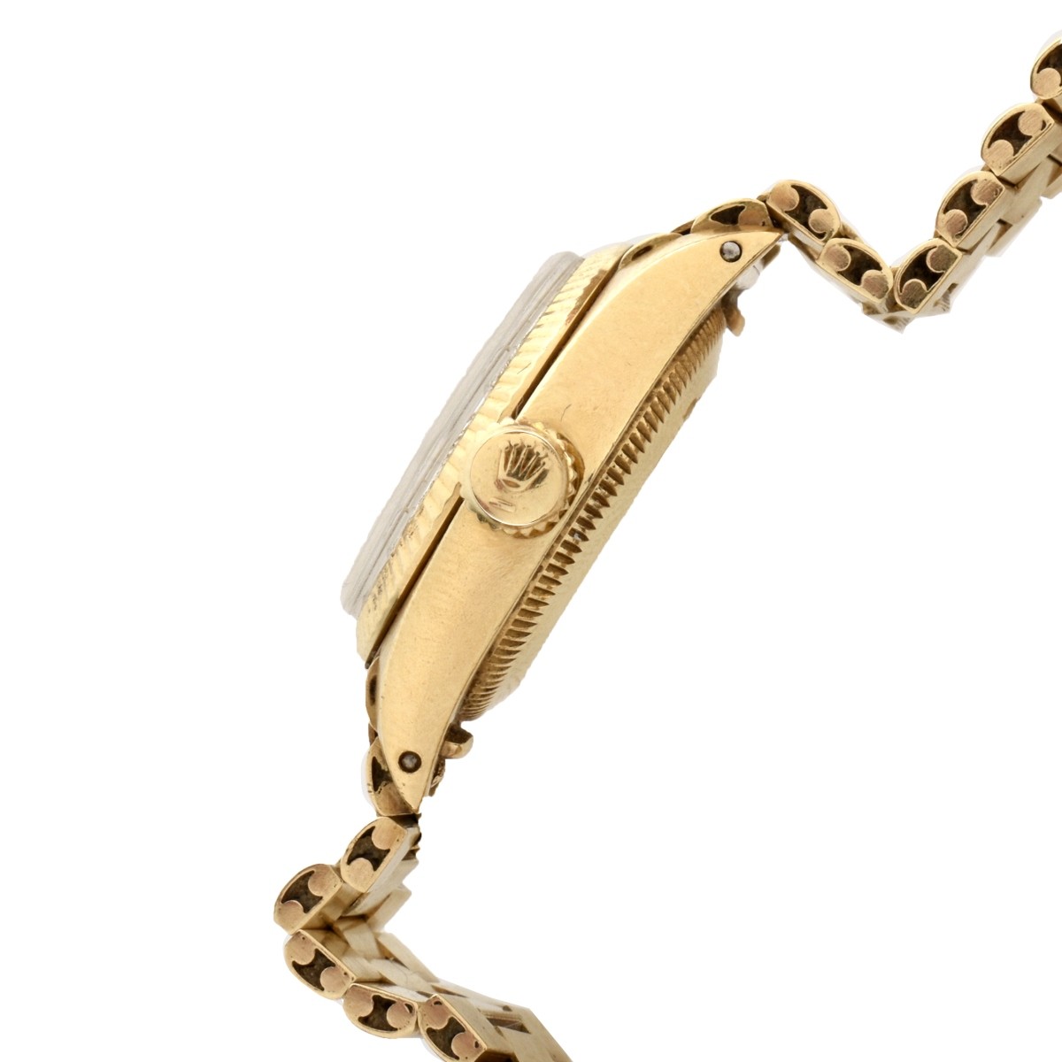 Lady's Vintage Rolex Oyster Perpetual 18 Karat Yellow Gold Watch, Champagne Dial. Automatic self-winding movement. Case measures 25.5mm. Bracelet measures 6" interior circumference. Approx. weight: 57.48 grams. No box or papers. Condition: Good vintage condition. Wear and scratches from normal use. For additional information and/or WhatsApp video please contact our resident GIA Graduate Gemologist, Russ Kodner at 954.650.5030 Estimate: $2000.00 - $3000.00 Domestic Shipping: $36.00