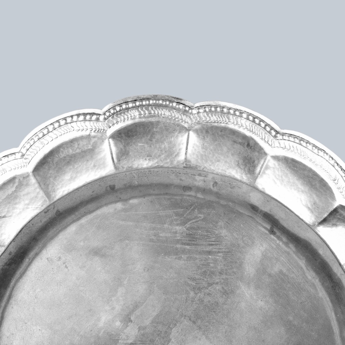 Vintage 900 Silver Charger with Scalloped Rim. Stamped 900. Measures 11-3/8" diameter. Approx. weight: 13.68 grams. Condition: Good vintage condition. Needs cleaning. Estimate: $100.00 - $200.00 Domestic Shipping: $64.00