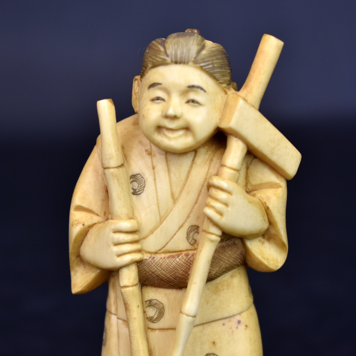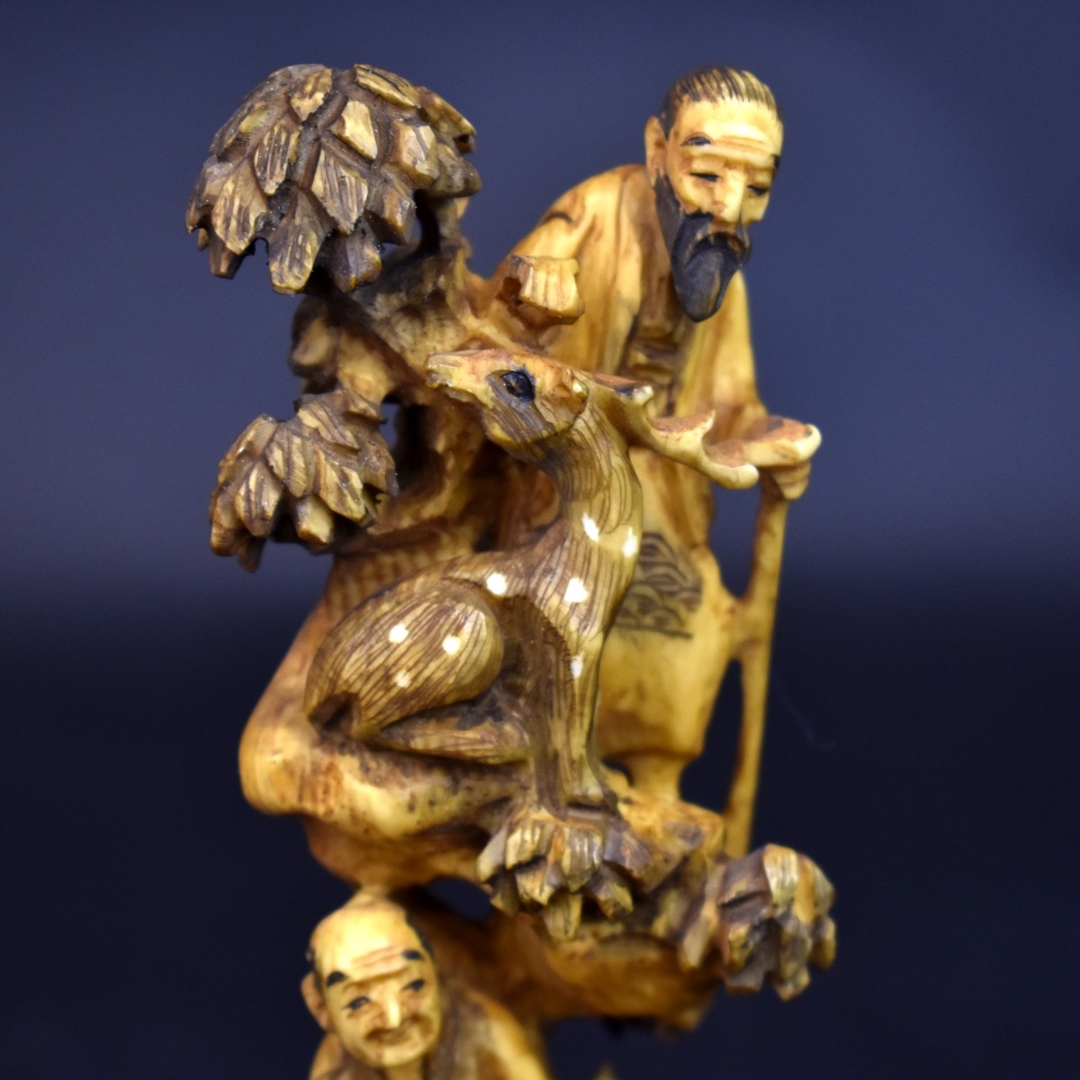 Lot of Two Japanese Polychrome Carved Figurines Consisting of a Okimono Figurine together with a Figurative Group. Both items are signed. Tallest measures 5-3/8" x 2". Figurine measures 4" x 2". We Will Not Ship This Item Out of State of Florida. Anyone Having This Item Shipped Must Have a Florida Address or the Item will not be Shipped. We will Not Knowingly Sell Endangered Species outside of Legal Channels. Estimate: $50.00 - $150.00 Domestic Shipping: $58.00