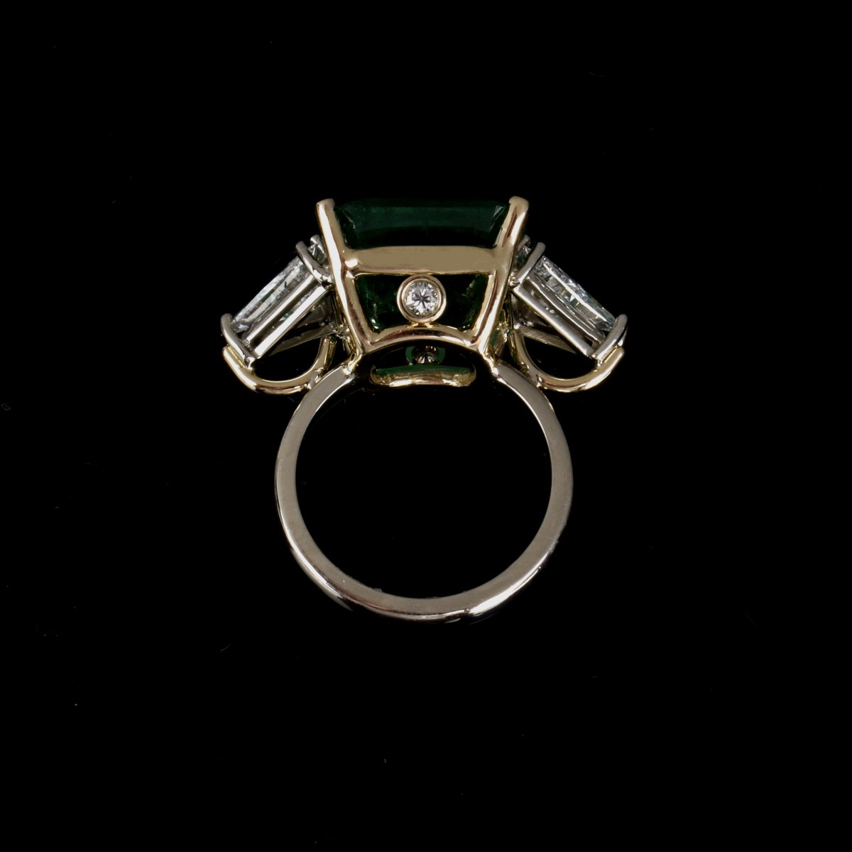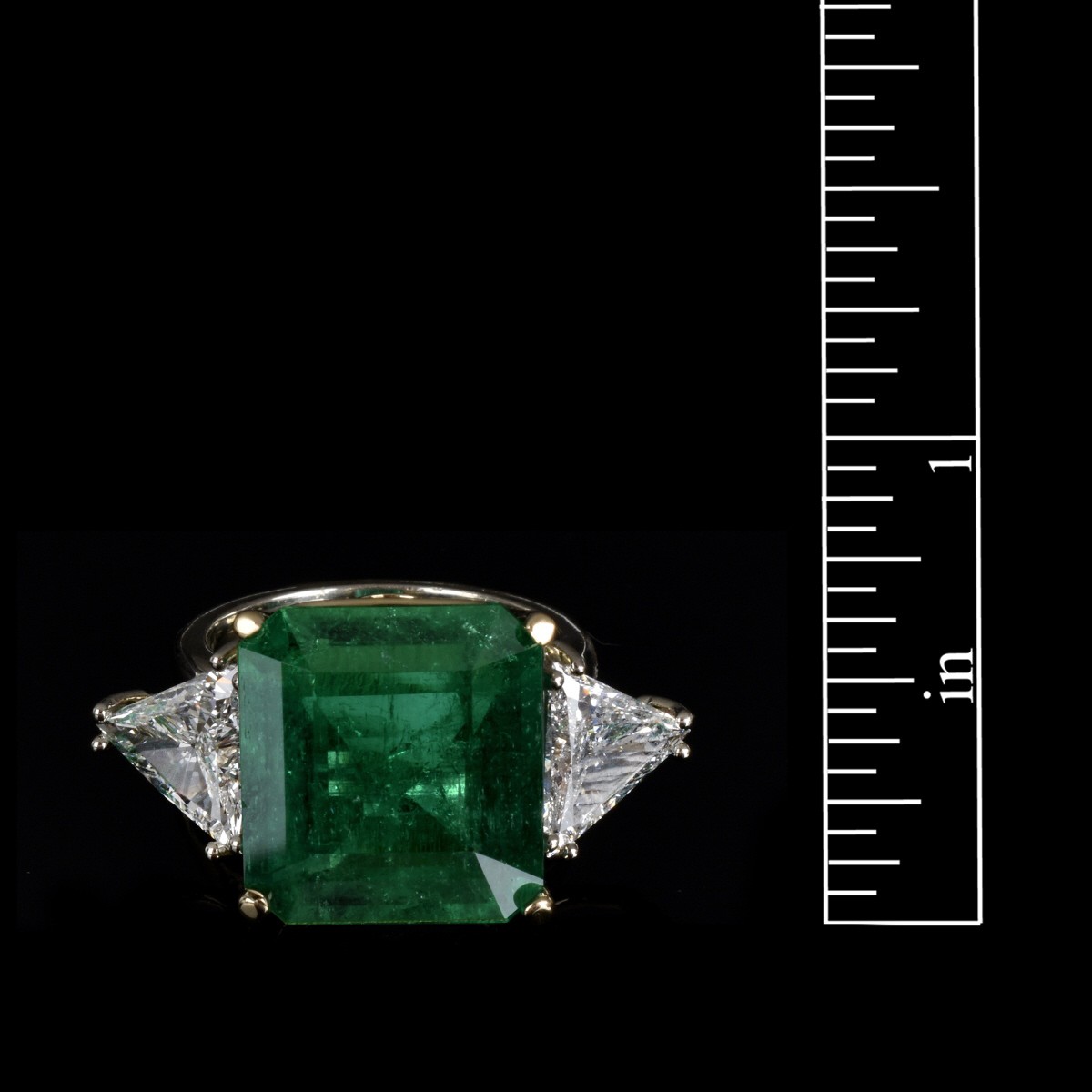 Important AGL Certified 12.99 Carat Gem Quality Colombian Emerald, GIA Certified 2.38 Carat TW Two Trillion Cut Diamond and 18 Karat White Gold Ring. Emerald with vivid color. Diamonds F color SI1 clarity and F color, I1 clarity. Ring size 8. Approx. weight: 12.5 grams. Accompanied by AGL report for emerald and GIA Report 22255600541 and 2225560542. Part of a four piece emerald and diamond suite offered in this auction and shown in photos attached. Condition: Very good condition. For additional information and/or WhatsApp video please contact our resident GIA Graduate Gemologist, Russ Kodner at 954.650.5030 Estimate: $160,000.00 - $200,000.00 Domestic Shipping: $40.00