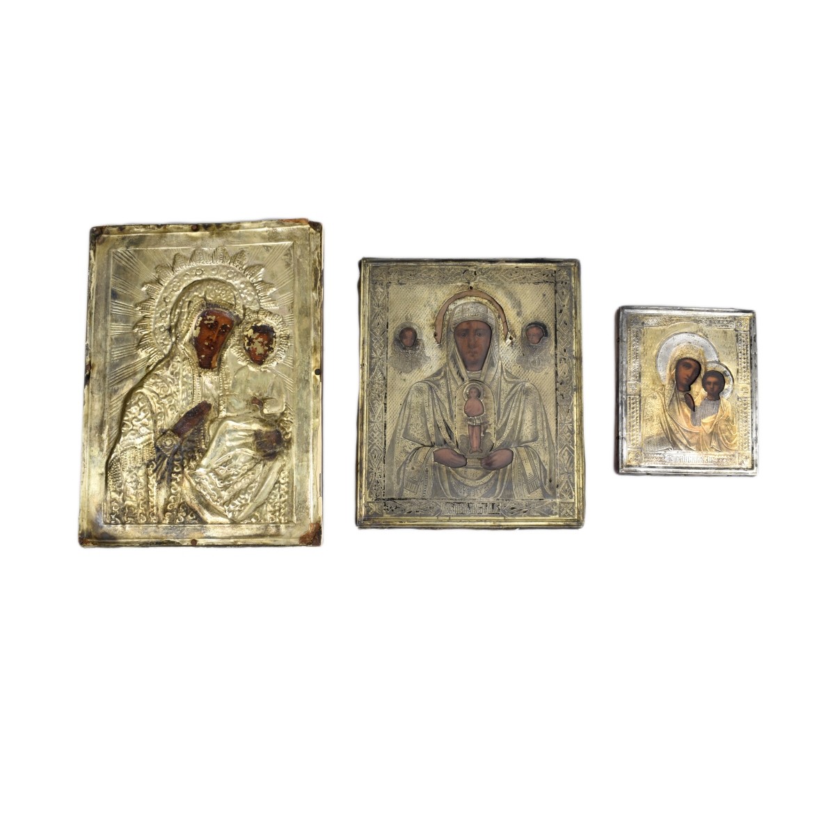 Lot of Three Antique Russian Silver Metal Mounted and Wooden Icons Depicting The Virgin Mary with Child. Two have cyrillic inscription lower center. Largest measures 8-5/8" x 6-1/4". Smallest measures 4-1/2" x 3-3/4". Condition: Largest icon has some rubbing to the portrait and surface wear otherwise good condition. Estimate: $200.00 - $300.00 Domestic Shipping: $66.00