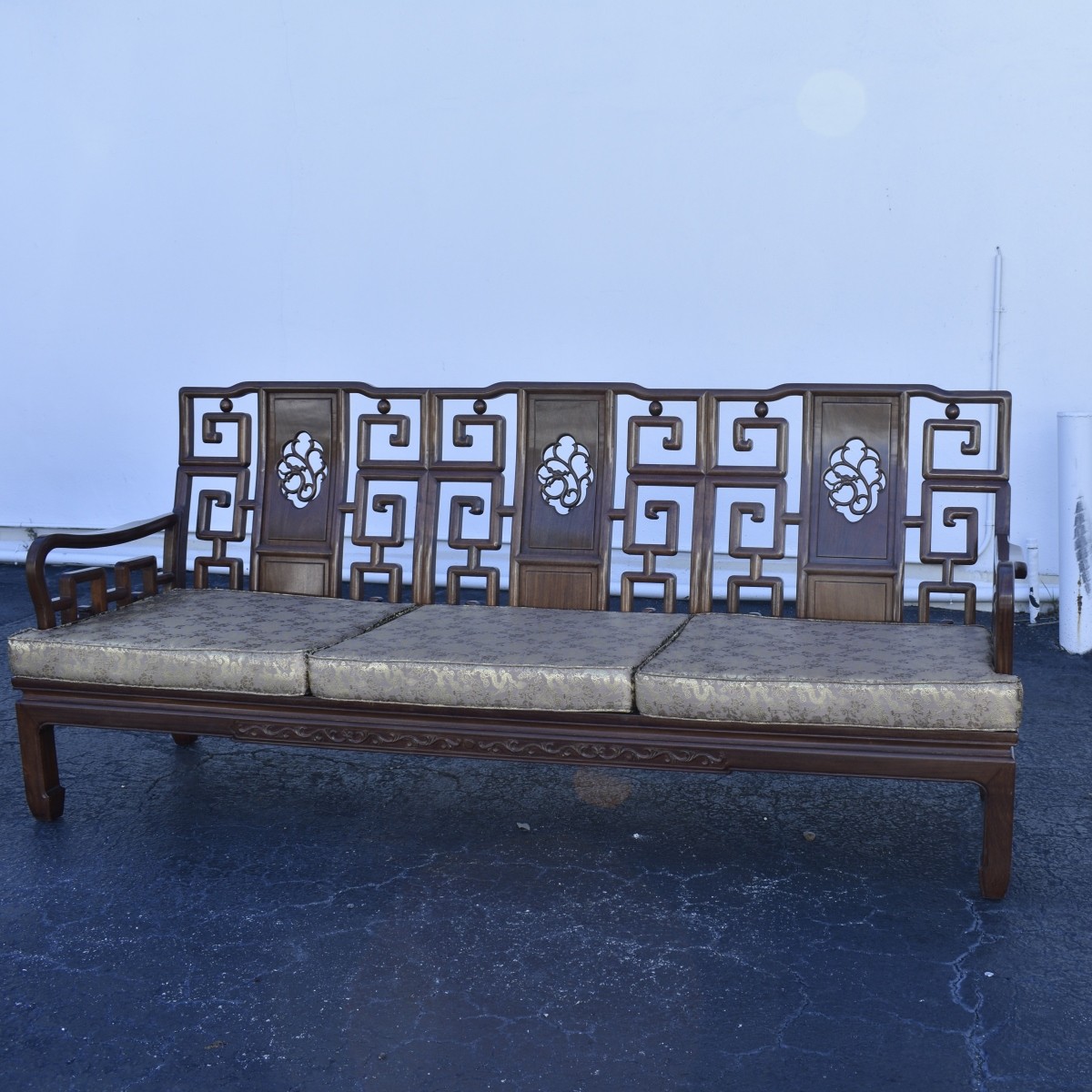 Mid Century Chinese Pierced Hardwood 3-Piece Living Room Set to Include a Pair of Armchairs and a Sofa With Silk Embroidered Cushions. Chairs measure 33-1/2" x 27-3/4" , seat height: 12". Sofa measures 33-1/2" x 77-1/2", seat height 12". Condition: Minor surface rubbing, small scuffs overall good condition. Estimate: $800.00 - $1200.00 Domestic Shipping: Third party