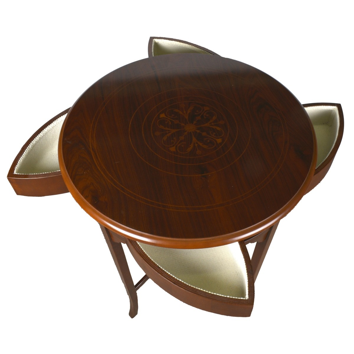 Vintage Inlaid Wooden Round Table with Rotating Top to Open Four Hidden Drawers. Measures 29-1/4" x 23-1/2". Condition: Good condition. Estimate: $100.00 - $300.00 Domestic Shipping: Third party