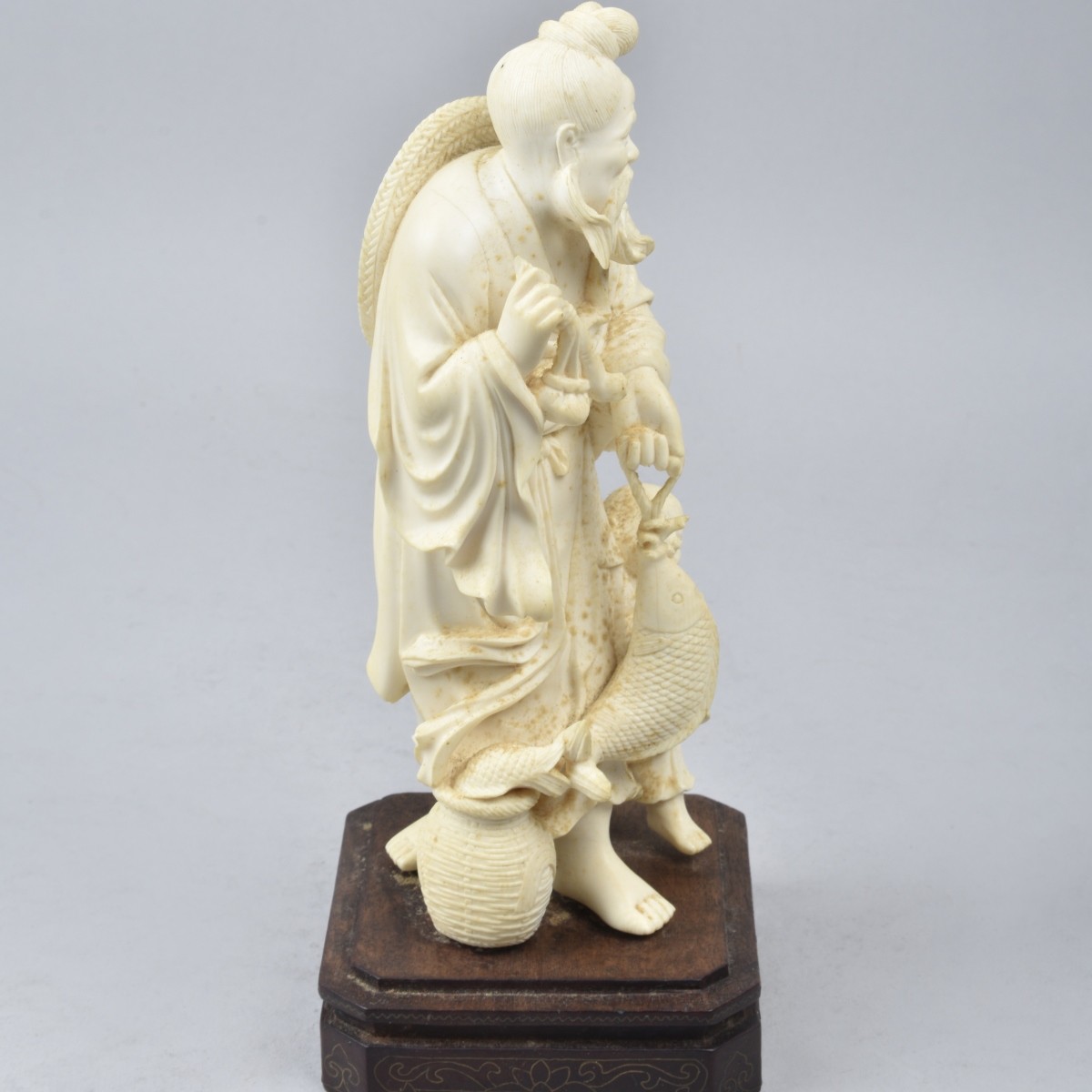 Antique Japanese Carved Fisherman with Child Group Presented on Wooden Base. Overall measures 9-1/4" x 4" x 3-3/4". Figurine measures 8" x 3-3/4" x 3". We Will Not Ship This Item Out of State of Florida. Anyone Having This Item Shipped Must Have a Florida Address or the Item will not be Shipped. We will Not Knowingly Sell Endangered Species outside of Legal Channels. Condition: Minor loss to the pipe, needs cleaning otherwise good condition. Estimate: $400.00 - $600.00 Domestic Shipping: $78.00
