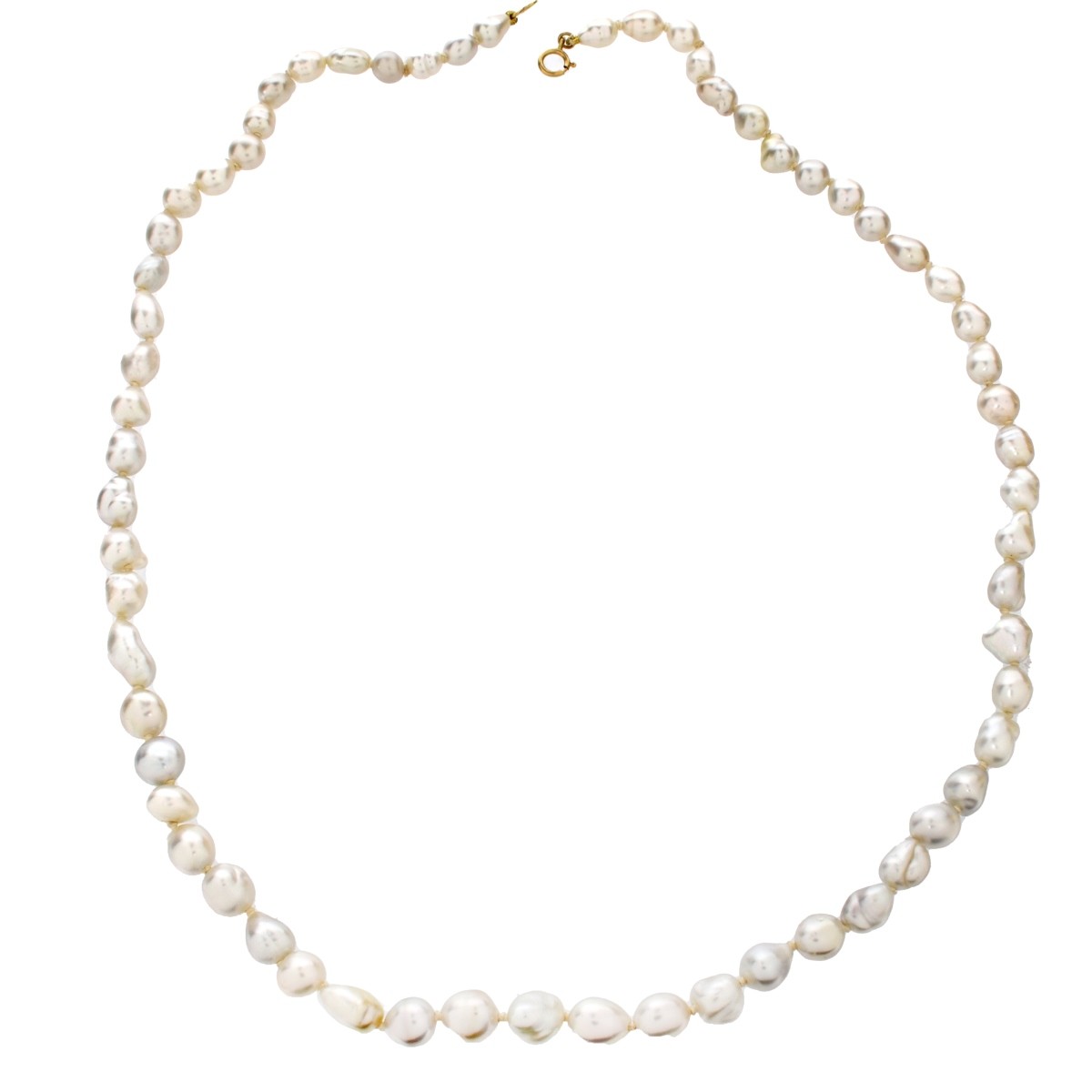 Vintage Graduated Baroque Pearl Necklace with 18 Karat Yellow Gold Clasp. Pearls measure approx. 5.5-7.0mm. Necklace measures 20" L. Approx. weight: 15.8 dwt. Estimate: $50.00 - $150.00 Domestic Shipping: $40.00 Condition: Very good vintage condition.