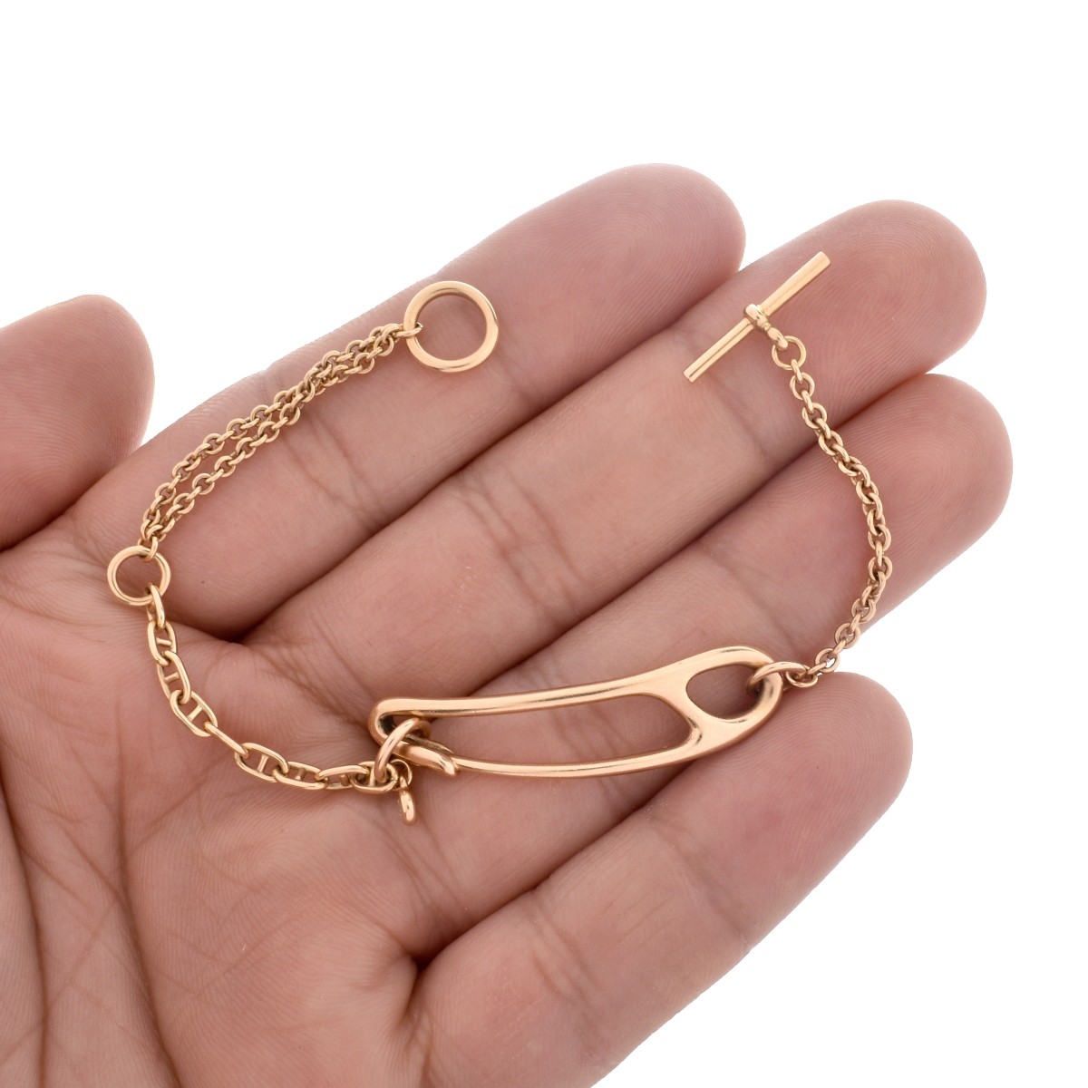 Vintage Hermes French 18 Karat Yellow Gold Chaine d'Ancre Punk Bracelet with Small Diamond Accent. Signed, stamped 750, French hallmark and numbered 19G139993. Measures 6-3/8" L. Approx. weight: 8.66 grams. Estimate: $1500.00 - $2500.00 Domestic Shipping: $36.00 Condition: Very good vintage condition. For additional information and/or WhatsApp video please contact our resident GIA Graduate Gemologist, Russ Kodner at 954.650.5030