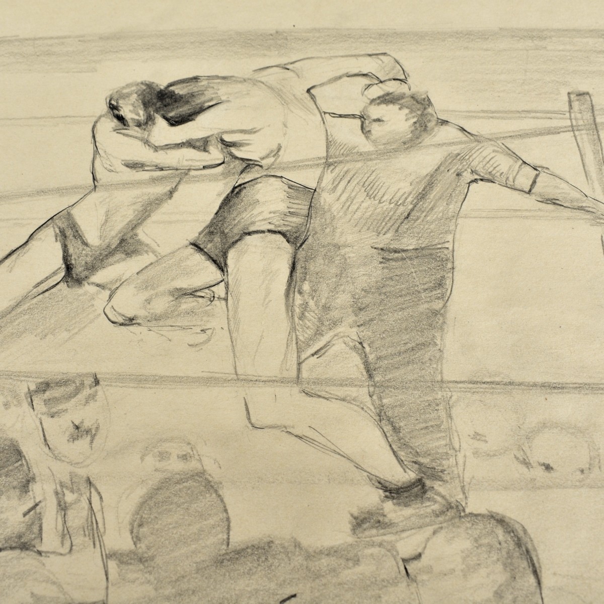 Attributed to: Fletcher Martin, American (1904-1979), Pencil Sketch on Paper, Boxing Match. Unsigned. Measures 10-1/4" H, 13-1/4" W. Estimate: $500.00 - $1000.00 Domestic Shipping: $48.00 Condition: Toning, tape and small tear to upper left corner.