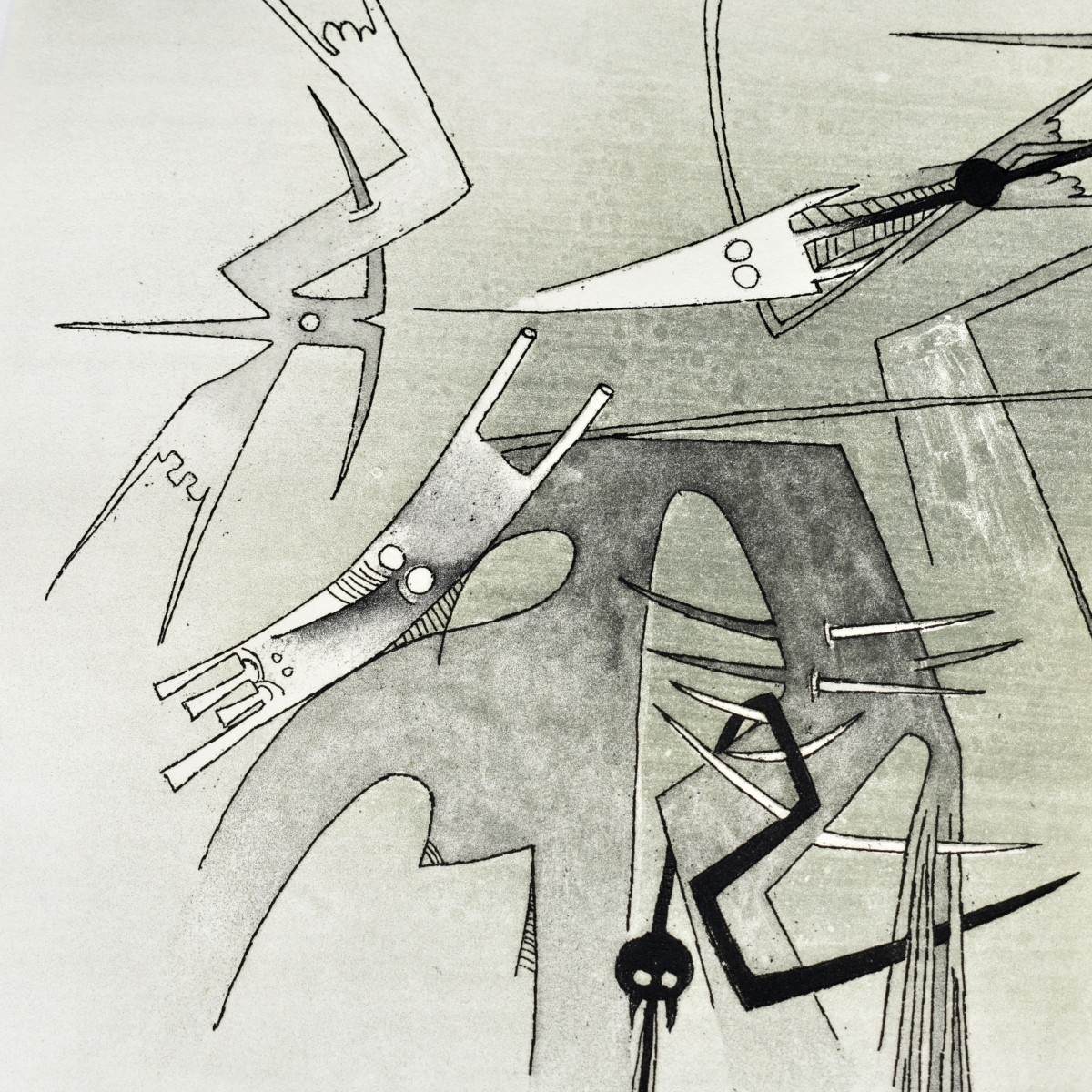 Wifredo Lam, Cuban (1902 - 1982) "Visible-Invisible" Etching on Paper, Signed and Numbered 45/99. Unframed. Sight measures 15-5/8" x 19-1/2". Overall measures 19-7/8" x 28". Estimate: $400.00 - $600.00 Domestic Shipping: $72.00 Condition: Fraying to the edges, some wear en verso that does not affect the front of the artwork.
