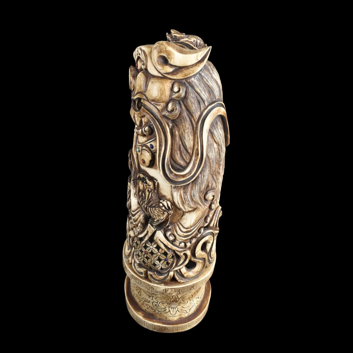 Impressive Pair of Chinese Finely Carved Foo Dog Figural Relief Sculptures with Inset Gemstones. Signed. Measures 13-1/4" x 5-1/4" x 4-1/4". We Will Not Ship This Item Out of State of Florida. Anyone Having This Item Shipped Must Have a Florida Address or the Item will not be Shipped. We will Not Knowingly Sell Endangered Species outside of Legal Channels. Estimate: $1000.00 - $20000.00 Domestic Shipping: Third party Condition: Small seam splits to the surface from age otherwise good condition.