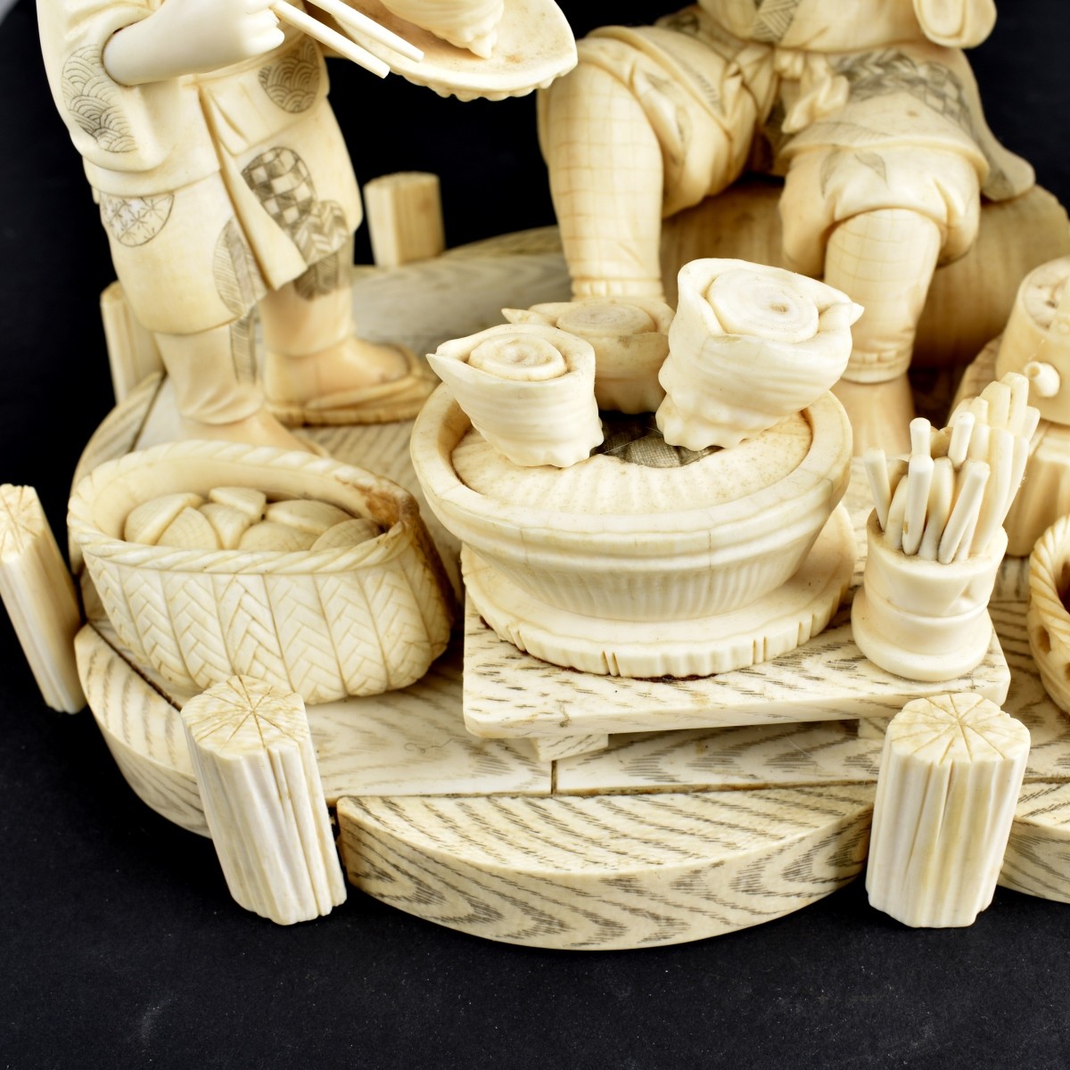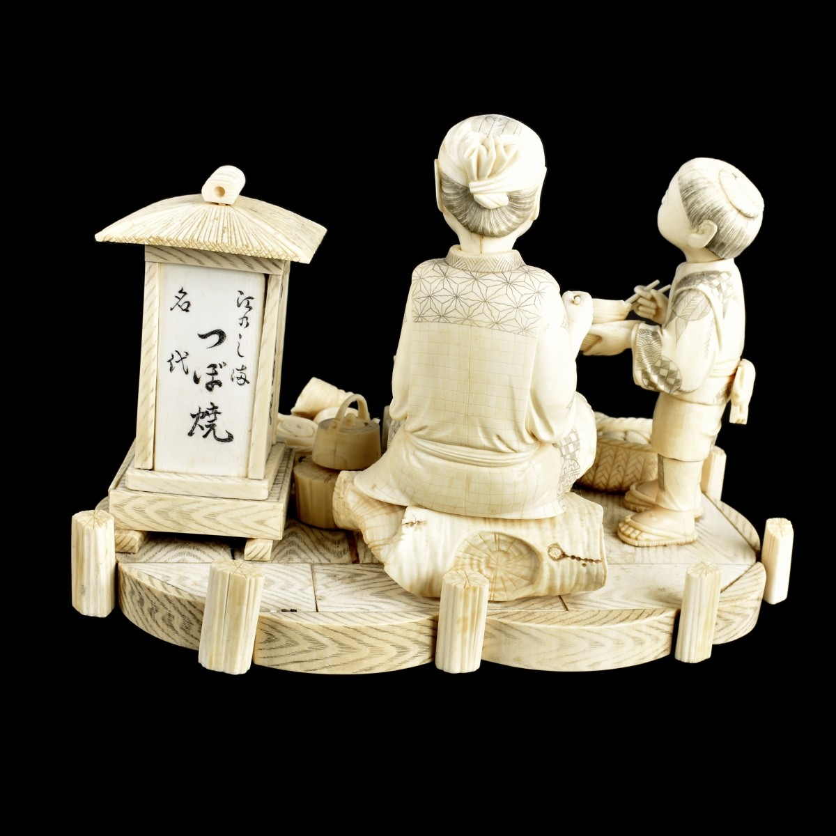 Rare Meiji Period Japanese Polychrome Carved Figural Group. Signed. Measures 7-3/8" x 11-1/2" x 7". We Will Not Ship This Item Out of State of Florida. Anyone Having This Item Shipped Must Have a Florida Address or the Item will not be Shipped. We will Not Knowingly Sell Endangered Species outside of Legal Channels. Estimate: $1000.00 - $2000.00 Domestic Shipping: Third party Condition: Some professional restorations to the seam splits