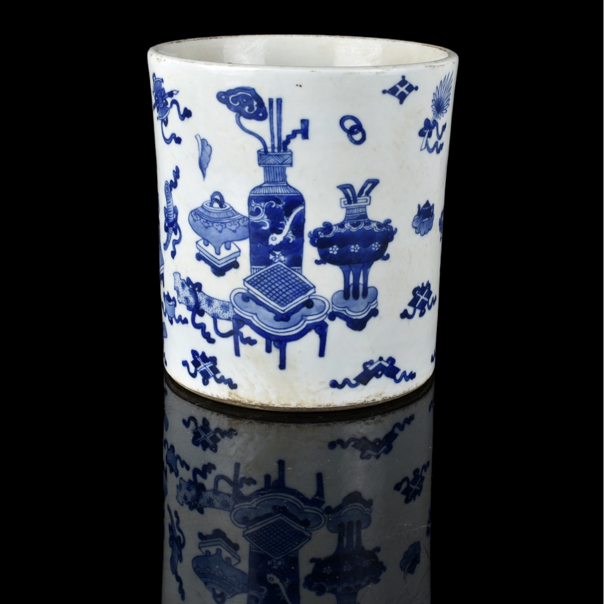 Chinese Blue and White Porcelain Bitong Brush Pot. Signed. Measures 6-1/2" x 6". Estimate: $200.00 - $400.00 Domestic Shipping: $78.00 Condition: Good condition.