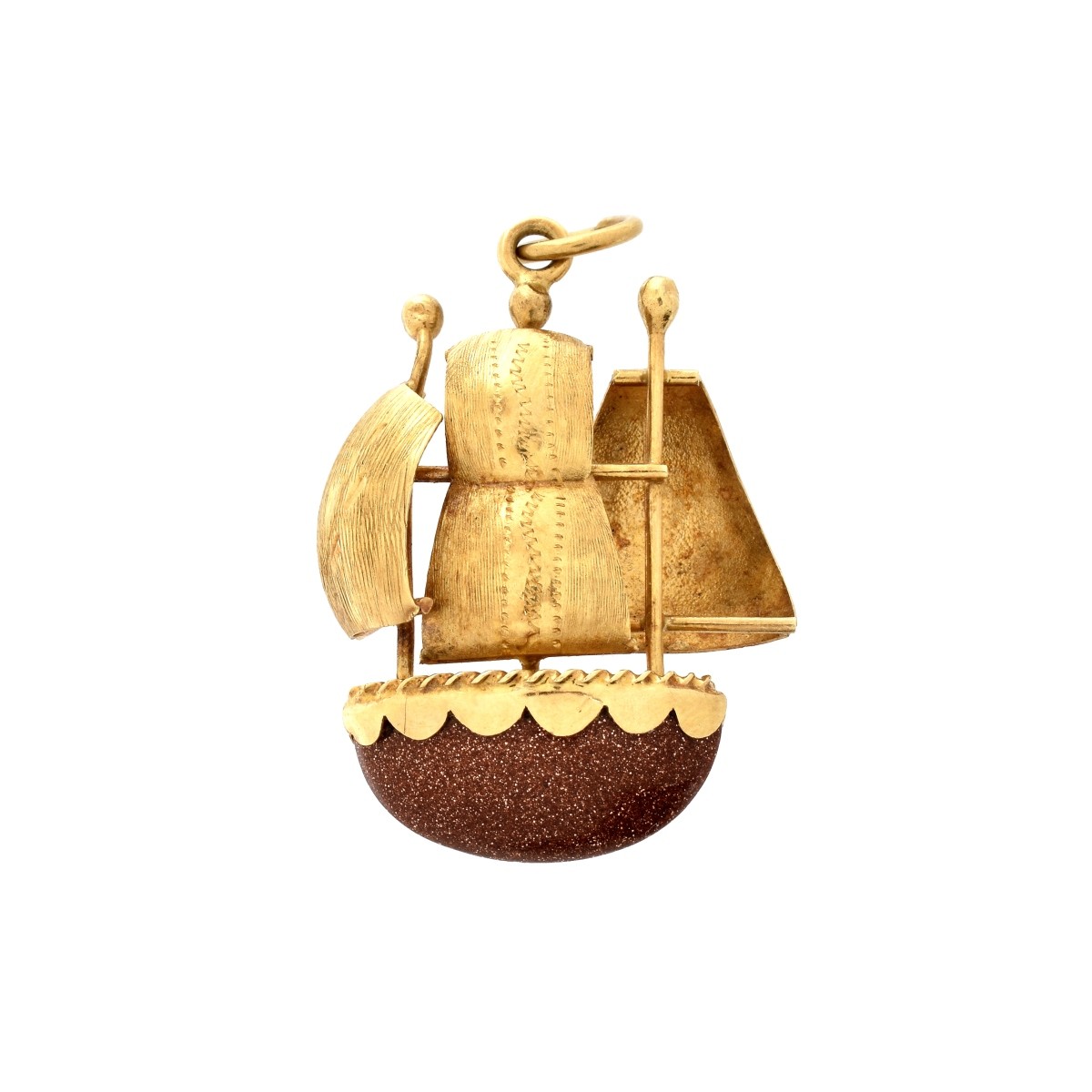 Vintage Italian 18 Karat Yellow Gold and Sunstone Ship Pendant. Stamped Italy 18K. Measures 1-1/2" H, 1-1/8" W. Approx. weight: 5.2 dwt. Estimate: $200.00 - $400.00 Domestic Shipping: $40.00 Condition: Very good vintage condition.