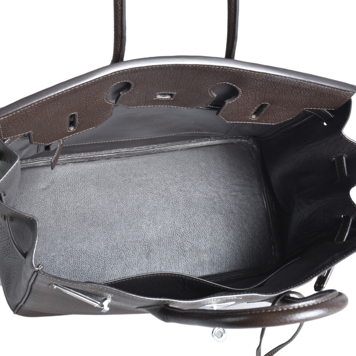 Replica Hermes Birkin Chocolate Leather Bag, White Metal Hardware. Measures 11-1/2" H (6" handle drop), 13-1/2" W. With dust cover. Estimate: $300.00 - $500.00 Domestic Shipping: $68.00 Condition: As New condition.