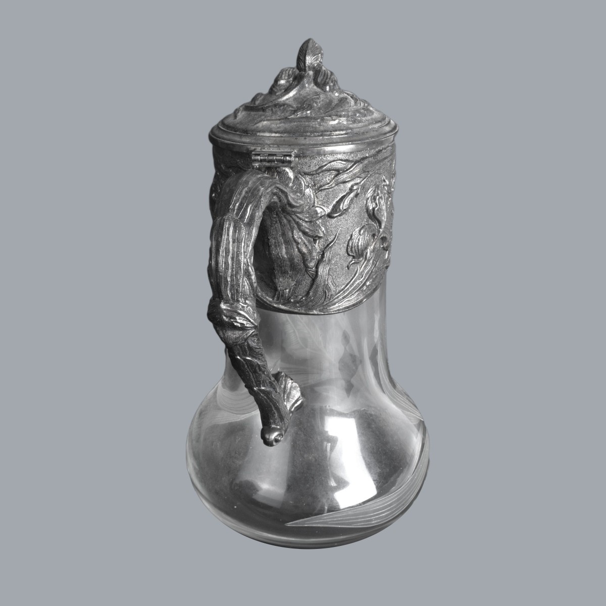 Pair of Art Nouveau Style Etched Glass Ewers with Floral Relief Silverplate Embellishment. Unmarked. Measures 11" x 7-1/2" x 5-3/4'. Estimate: $100.00 - $300.00 Domestic Shipping: $88.00 Condition: Silverplate needs cleaning otherwise good condition.
